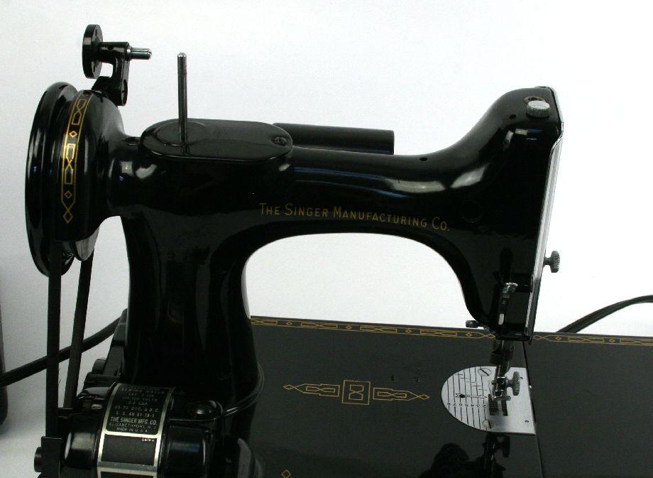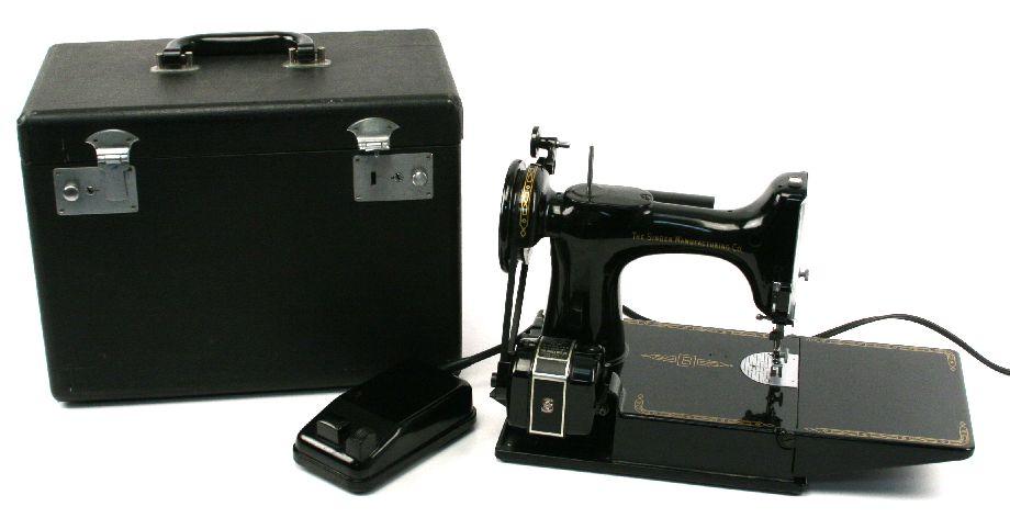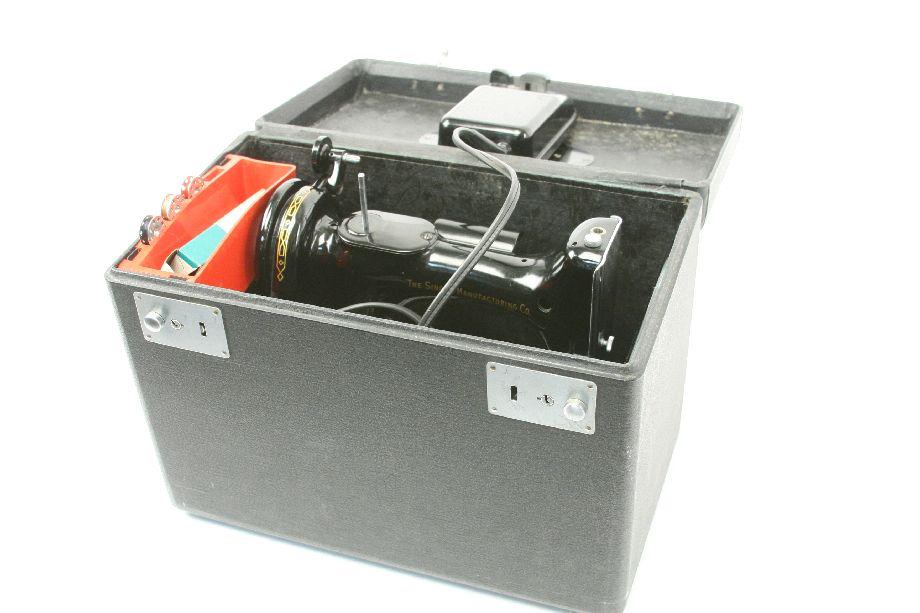 Lot includes: Singer Feather weight electric portable sewing machine complete with original case, oil container, tools, key, electric cord and foot pedal. In overall excellent condition.