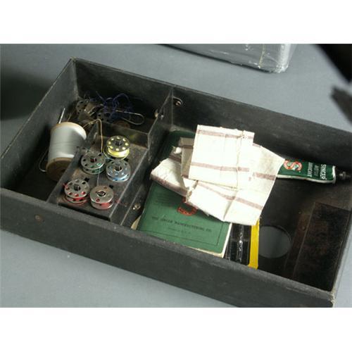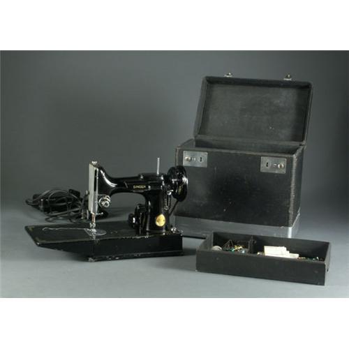 SINGER FEATHERWEIGHT SEWING MACHINE: A 1947-1948 Elizabethport, New Jersey, sewing machine. The serial number is AH799691, stamped on underside. Model number 221-1, black with gold detail, power cord, bobbins, users manual, lubricant, original carry case, powers up electrically but otherwise untested, paint loss and chipping noted to base, case shows signs of use with a band of duct tape around bottom,sold as seen.