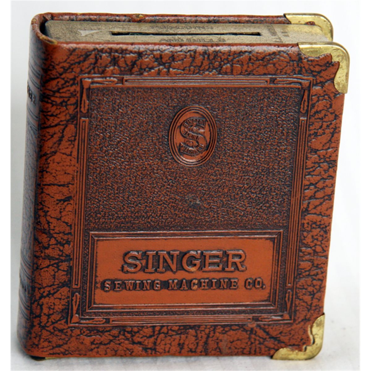 SINGER SEWING MACHINE CO. Coin slot on top. Key lock, with no key present. No serial number. 8cm x 9cm x 2cm. Reddish-brown cloth or leatherette cover. ‘Singer’ on spine. Maker-Zell Prods. Co. N.Y. Pats. pending. VF.