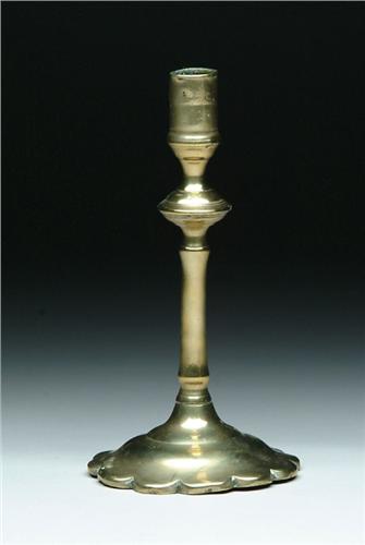 SINGLE PETAL BASE QUEEN ANNE BRASS CANDLESTICK. Nice form, cylinder candle cup. SIZE: 7-1/2in. h. CONDITION: Good. 9-26043
