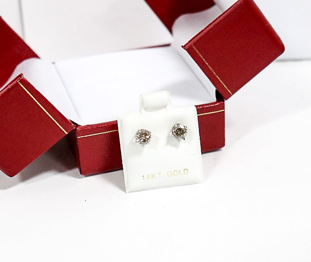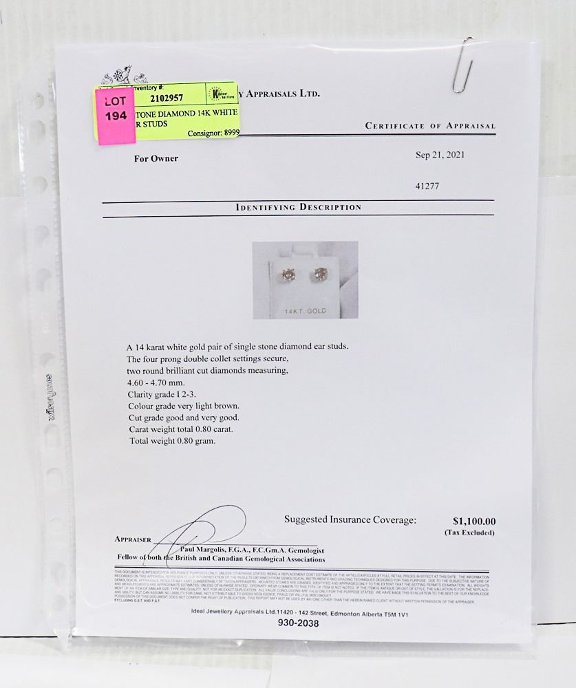 A 14 KARAT WHITE GOLD PAIR OF SINGLE STONE DIAMOND EAR STUDS. THE FOUR PRONG DOUBLE COLLET SETTINGS SECURE, TWO ROUND BRILLIANT CUT DIAMONDS MEASURING, 4.60 - 4.70MM. CLARITY GRADE I 2-3. COLOUR GRADE VERY LIGHT BROWN. CARAT WEIGHT TOTAL0.80 CARAT. TOTAL WEIGHT 0.80 GRAM. SUGGESTED INSURANCE COVERAGE: $1100.
