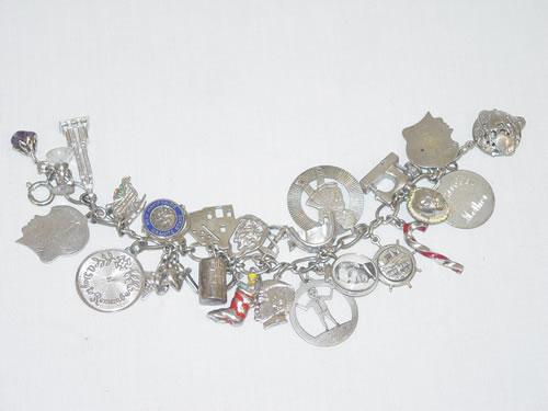 SINGLE STRAND STERLING CHARM BRACELET W/ (25) SILVER CHARMS (APPROX. 2.3 TROY OZ.)