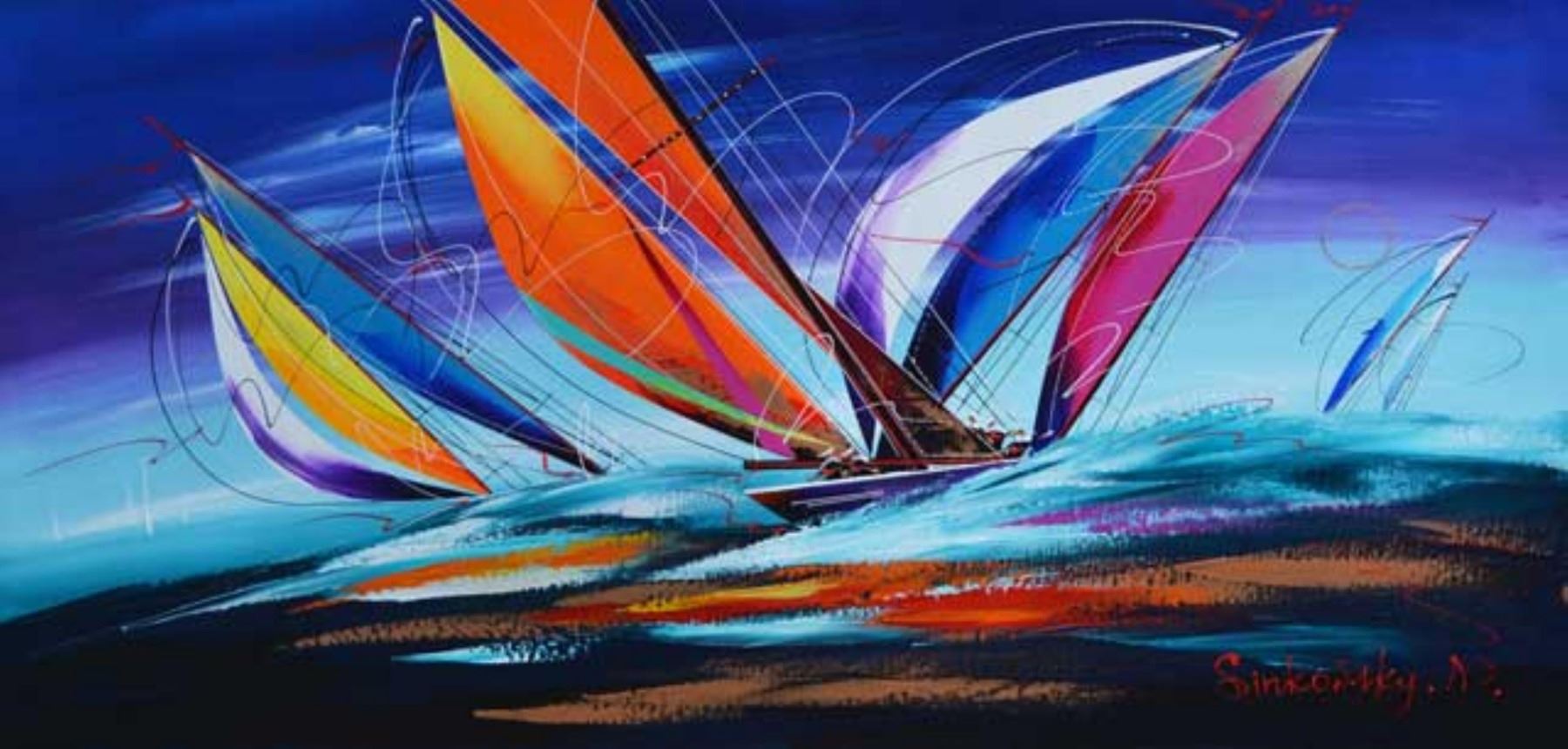 Artist: Natalia Sinkovsky - Title: Sailing #6 - Medium: Original Acrylic on Canvas - Signature: This one-of-a-kind work is hand-signed by the artist at the bottom of the image - Image Size: Approximately 20 inches x 40 inches - Unframed on Unstretched Can