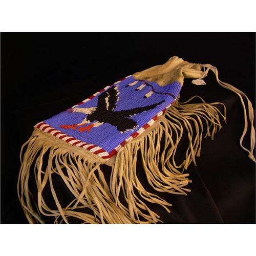 BEADWORK: Sioux beaded fringed pipe bag having patriotic color scheme and spread eagle beneath a feathered calumet against a blue ground. Third quarter 20th c. 9'' x 5.5'' beaded portion