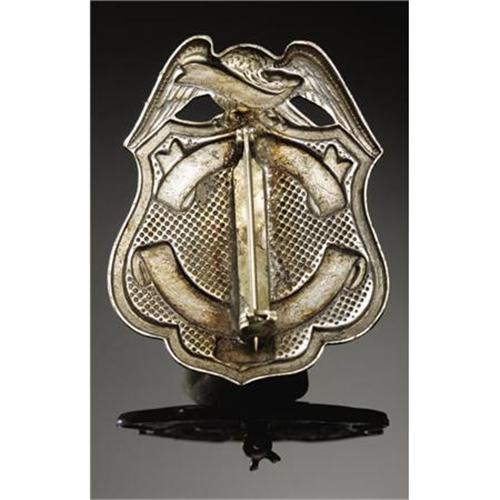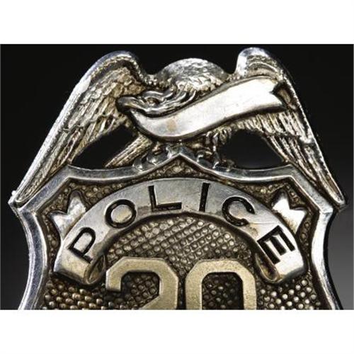 <B>SIOUX FALLS, SOUTH DAKOTA POLICE “20” SHIELD BADGE CIRCA 1910-20</B></I> - <BR>A nicely worn eagle-topped shield badge made of nickel plated brass. The “20” on the front is brass. The reverse has an unusual one-piece swivel-type pin, with one side flattened and welded down, resembling a cover plate. The pin catch is the jeweler's type. The badge is in worn condition but has a pleasing overall look.<I> From The George Jackson Collection.</B></I><BR><BR><b>Shipping:</b> Miscellaneous Collectibles, Smal (<a target="_blank" href="http://www.heritageauctions.com/common/shipping.php">view shipping information</a>)
