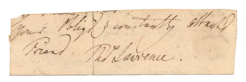 SIR THOMAS LAWRENCE (1769 - 1830) A notable English painter, mostly of portraits. Signature cut from the conclusion of a letter. 4 1/4” x 1 1/4”. Mounting trace on verso. Fine.