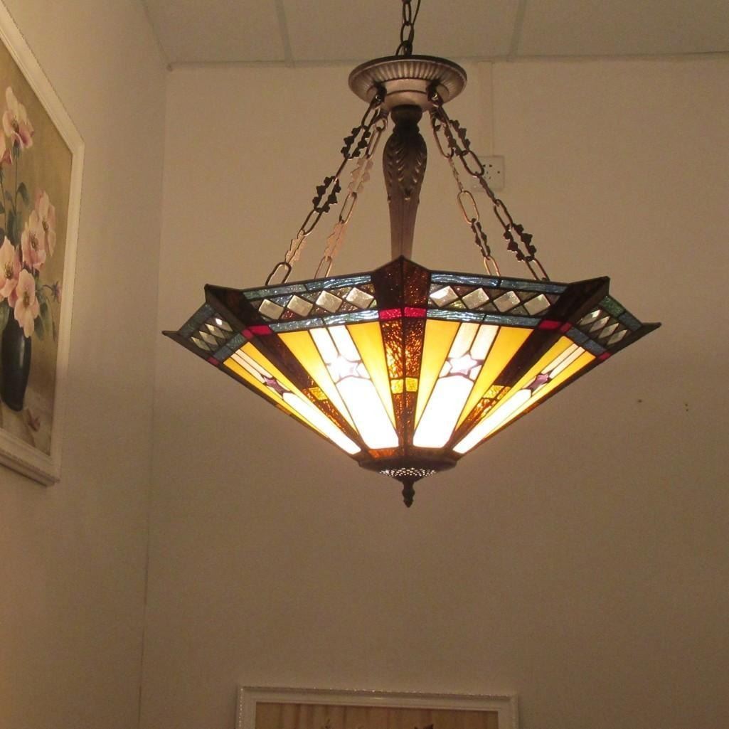 Sirius, a majestic Tiffany-style inverted pendant that adds mid-century charm to your home. The shade is accented with glistening jewels of midnight blue and amber, representing dazzling stars shining in the sky. It is perfect for foyer, living room, and dining area. Â (Max hanging distance: 81 inch) Glass TypeTiffany-glass Net Weight (lbs)11.68 Overall Length25.2 Overall Width25.2 Overall Height23.3 Max Hanging Distance81 Shade Width25.2 Shade Height7.87 Mid-Stem(s) Height17.1 Mid-Stem MaterialsMetal; Poly-resin Ceiling Chain, Stem, Wire Length60 Electric Wire Length84 Threaded Pipe/Finial Length6.2 Threaded Pipe/Finial MaterialMetal Canopy Width4.8 Canopy Height1.18 Canopy MaterialsMetal Wattage/Bulb Types(3) 100 Watt max E26 Type A Bulb (not included) Switch TypeHardwired Est. Glass Cuts248pcs glass cut Est. Glass Beads40 beads Light DirectionUplight Specific UsesIndoor FinishDark Antique Bronze Overall MaterialsGlass, resin, metal & electrical components Glass Thickness0.12 Shade ShapeOtagon
