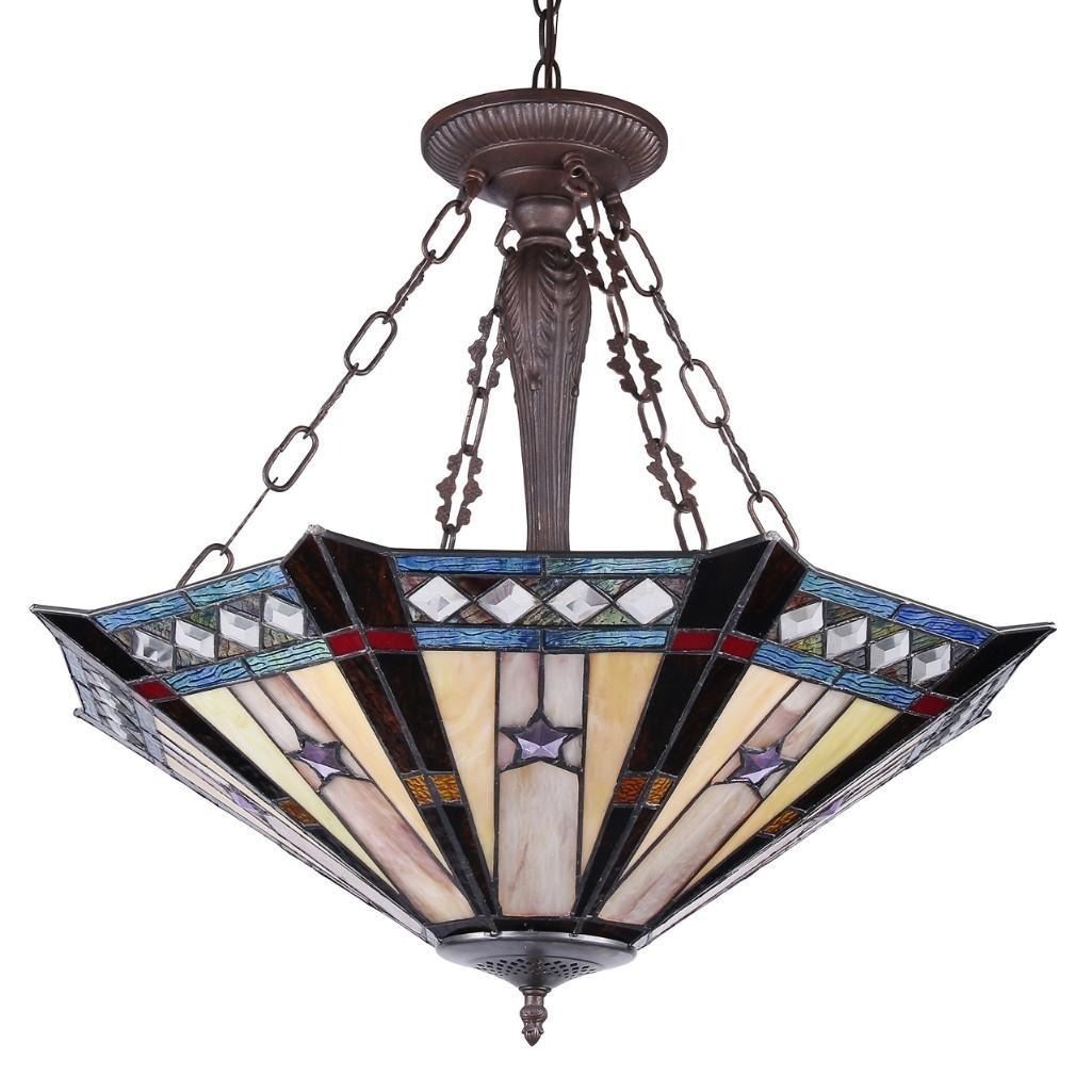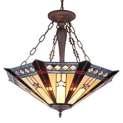 Sirius, a majestic Tiffany-style inverted pendant that adds mid-century charm to your home. The shade is accented with glistening jewels of midnight blue and amber, representing dazzling stars shining in the sky. It is perfect for foyer, living room, and dining area. Â (Max hanging distance: 81 inch) Glass TypeTiffany-glass Net Weight (lbs)11.68 Overall Length25.2 Overall Width25.2 Overall Height23.3 Max Hanging Distance81 Shade Width25.2 Shade Height7.87 Mid-Stem(s) Height17.1 Mid-Stem MaterialsMetal; Poly-resin Ceiling Chain, Stem, Wire Length60 Electric Wire Length84 Threaded Pipe/Finial Length6.2 Threaded Pipe/Finial MaterialMetal Canopy Width4.8 Canopy Height1.18 Canopy MaterialsMetal Wattage/Bulb Types(3) 100 Watt max E26 Type A Bulb (not included) Switch TypeHardwired Est. Glass Cuts248pcs glass cut Est. Glass Beads40 beads Light DirectionUplight Specific UsesIndoor FinishDark Antique Bronze Overall MaterialsGlass, resin, metal & electrical components Glass Thickness0.12 Shade ShapeOtagon