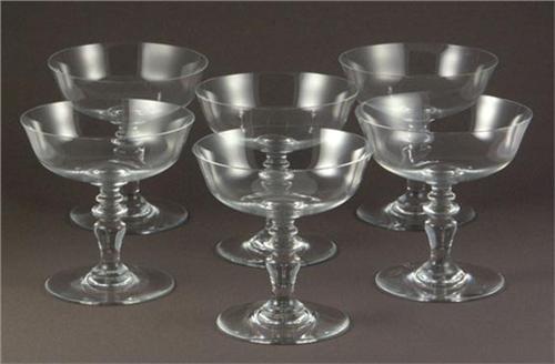 BACCARAT CRYSTAL: Six French Baccarat crystal stemware champagne coupes or sorbet dishes, hallmarked with Baccarat stamp on underside, each measures 4 1/4''H x 4 1/4''W, no chips or damage noted.