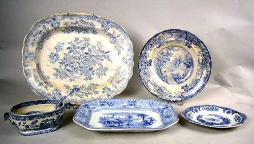 SIX BLUE AND WHITE STAFFORDSHIRE ITEMS; Including a platter, 14"l, a bowl, a square platter, an oval dish, a gravy boat and a spoon, (losses)