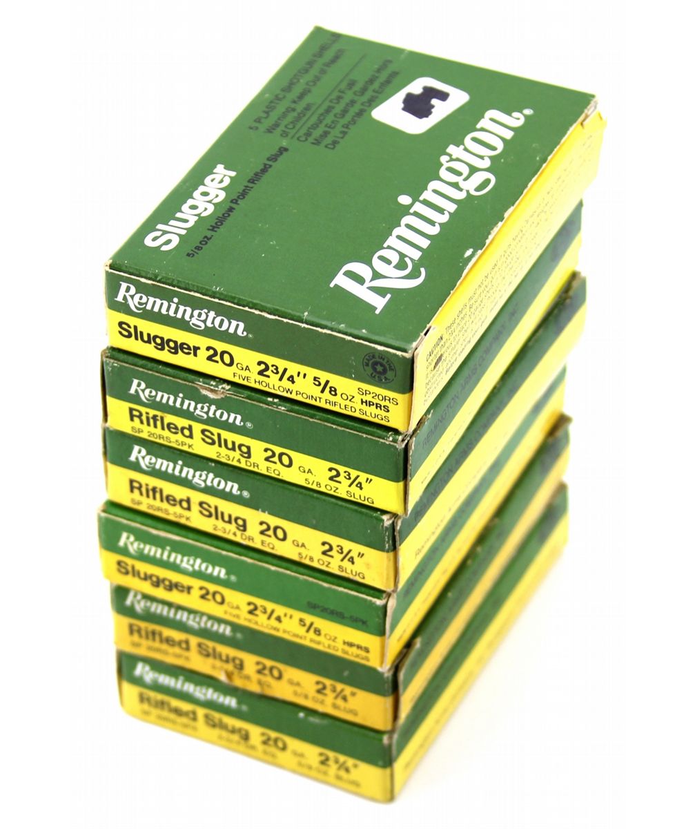 SIX BOXES OF 20 GA RIFLED SLUGS 2 3/4 INCH 5/8 OZ Six boxes of 2 3/4 inch, 5/8 oz rifled 20 gauge slugs. 6 boxes of 5 per box. Caliber / Guage: No Brand: Remington Condition: