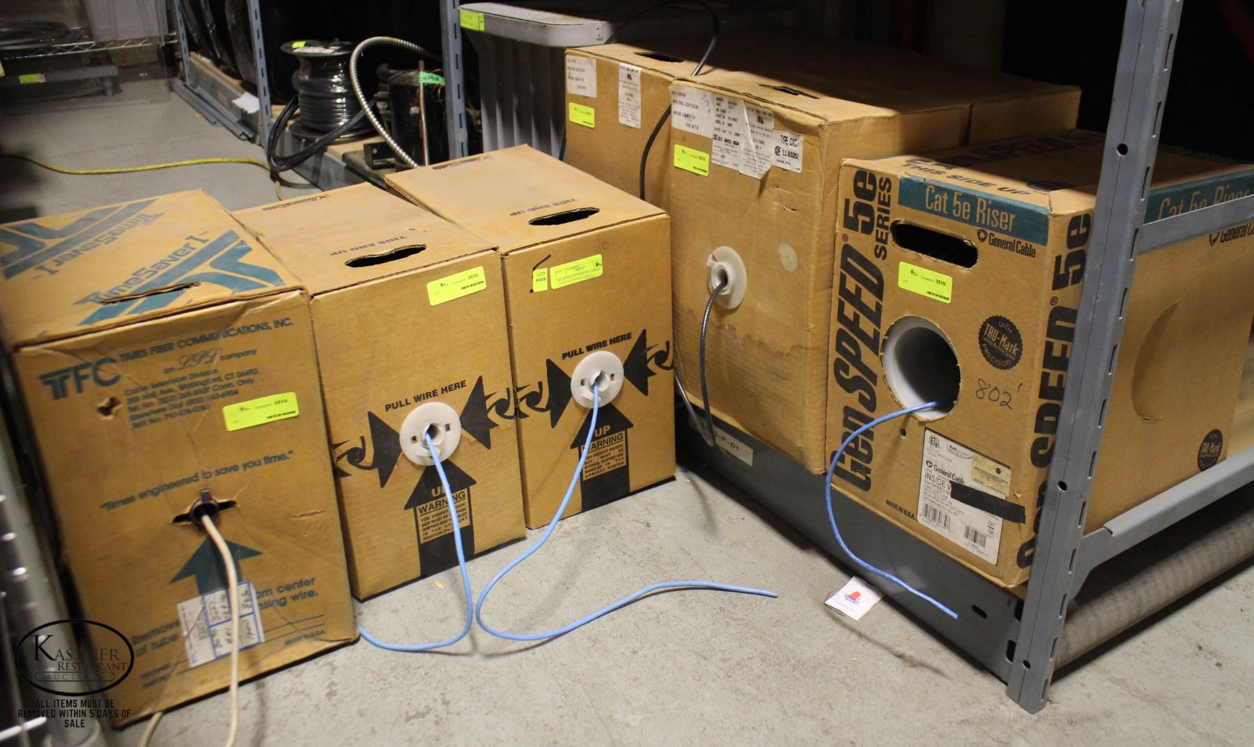 AT LEAST 2 FULL BOXES OF CAT5E **ALL ITEMS MUST BE REMOVED BY 5PM MONDAY, SEPTEMBER 12TH, 2022. ALL REMAINING ITEMS WILL BE SUBJECT TO A $6.00 PER DAY STORAGE CHARGE. ANY ITEMS REMAINING AFTER MONDAY, SEPTEMBER 26TH, 2022 WILL BE CONSIDERED FORFEITED. NO REFUNDS WILL BE ISSUED FOR FORFEITED ITEMS.** TO SCHEDULE A PICK UP APPOINTMENT CLICK HERE