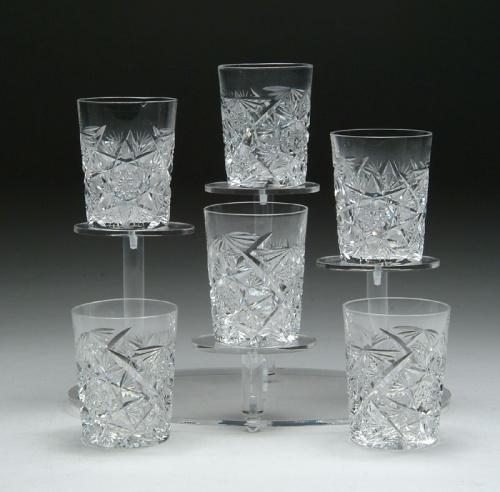 SIX CUT GLASS TUMBLERS. Nice set of tumblers are cut in hobstar and fan pattern. SIZE: 3-3/4 in. t. CONDITION: One has a rim chip, otherwise very good to excellent. Estate of Edwin Schiebel Sr. 5-60099