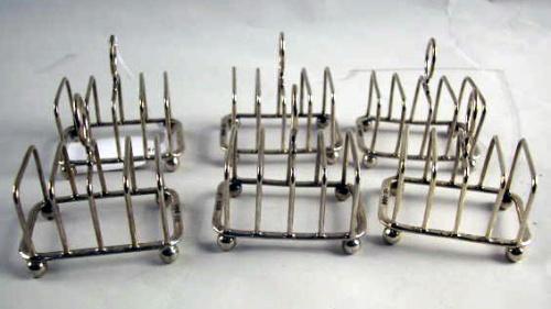 SIX ENGLISH STERLING SILVER MINIATURE TOAST RACK STYLE LETTER HOLDERS;
