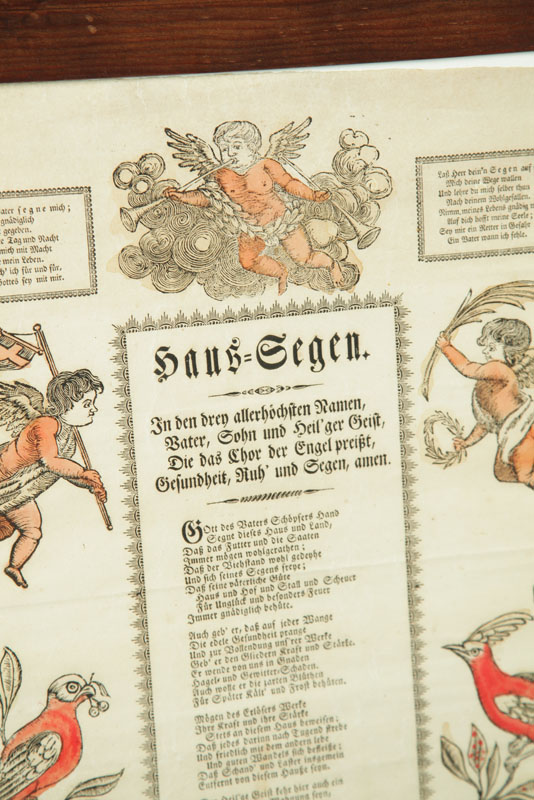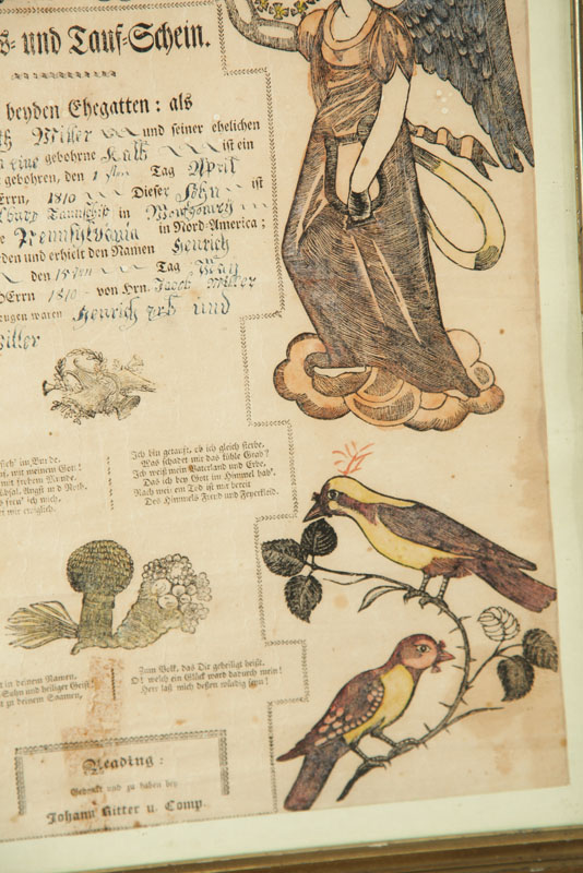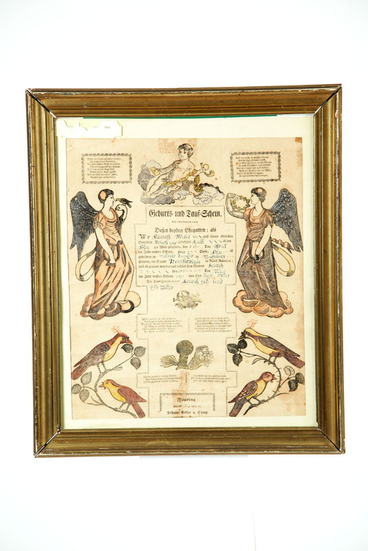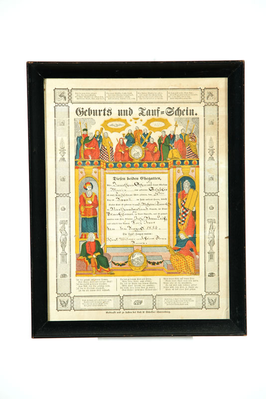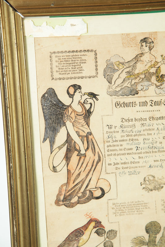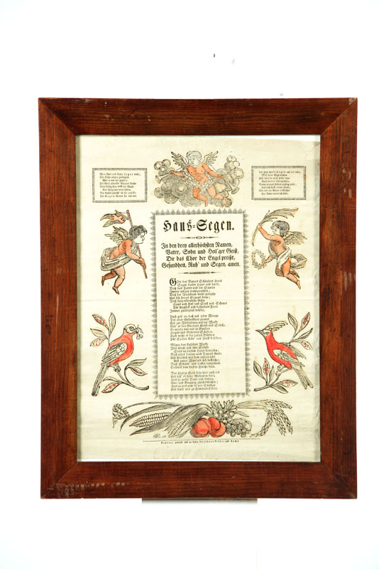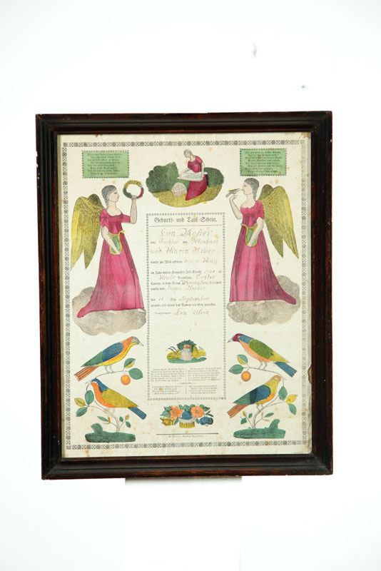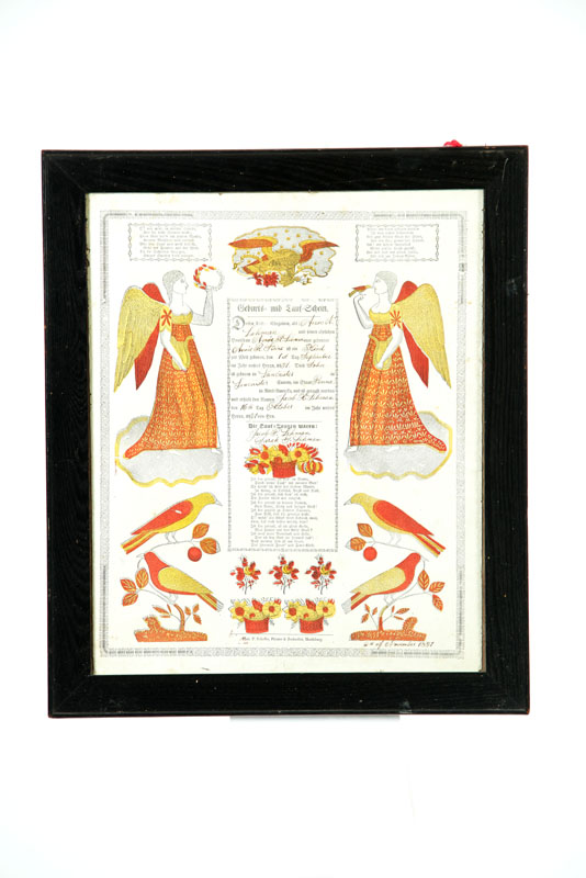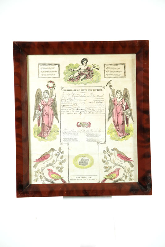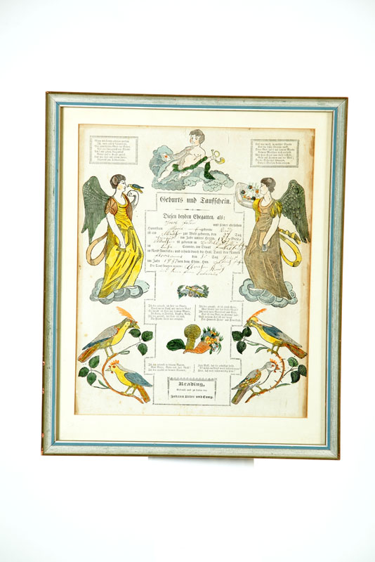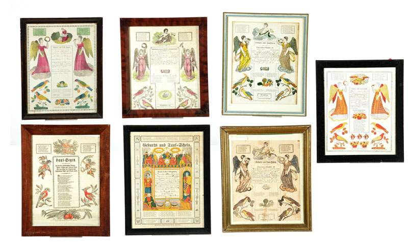 American, mid 19th century. Handcolored printed frakturs. Five birth certificates and a house blessing, all printed in Harrisburg or Reading, Pennsylvania. Some damage. All in frames, average 18"h. 16"w. Together with a replica fraktur with handcoloring. In a frame, 15 1/2"h. 14"w.
