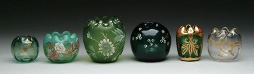 SIX GLASS ROSE BOWLS. Lot consists of one clear crystal rose bowl with gold enamel scrolls, a translucent green miniature rose bowl with gold floral decoration, an opalescent rose bowl with enamel floral decoration, a miniature translucent green rose bowl with gold and rust enamel decoration, an emerald green rose bowl with white and yellow enamel flowers and a frosted lime green rose bowl with enamel floral decoration. One is pictured in the "Collectible Glass Rose Bowls" by Johanna Billings fig. 192 pg. 64. Accompanying lot is an autographed copy of "Collectible Glass Rose Bowls" by Johanna Billings with Sean Billings. SIZE: Range from 2-1/2 in. to 3-1/2 in. dia. CONDITION: One rose bowl has considerable roughness around the edges, the others are very good to excellent Collection of Johanna and Sean Billings 5-60852, 5-60861, 5-60874, 5-60932