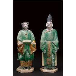 SIX GLAZED POTTERY, FIGURES, of five officials and a woman, all in green glazed robes; from a f...