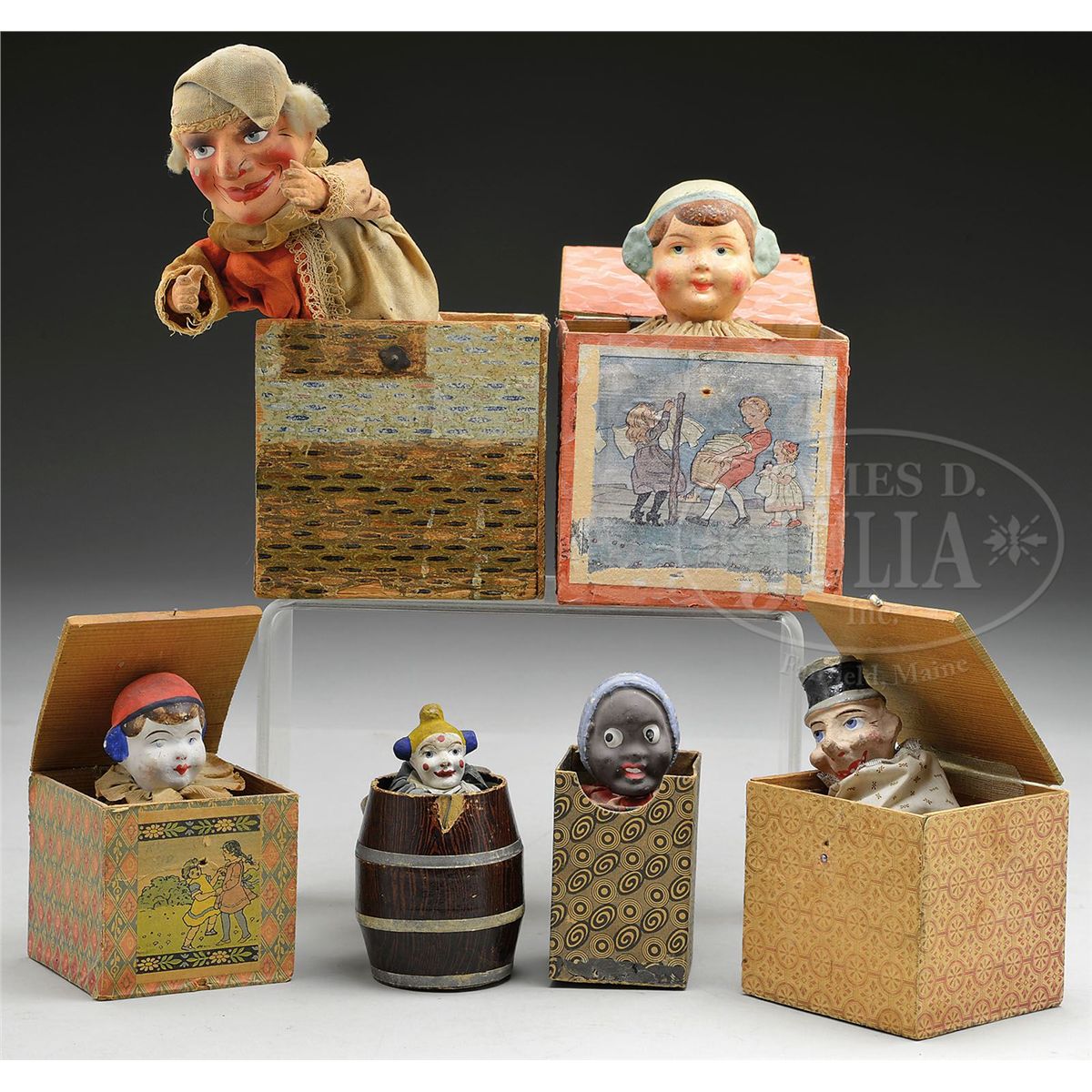 All of Germany manufacture. Circa 1890-1910 with hand painted composition heads. 1) Paper on wood box with crepe paper clothing on spring loaded figure. 2) Paper barrel holds spring loaded composition and crepe paper clown. 3) Decorated paper box holds Black Mammy with cloth dress. 4) Paper on wood box with spring loaded English character in composition. 5) Paper on wood flip open box with hand painted girl - crepe paper clothing. 6) A larger spring loaded "Punch" with colorful clothing and hand painted composition features. SIZE: Largest 10" t. CONDITION: Good to very good with two boxes not retaining lids. 1-13491