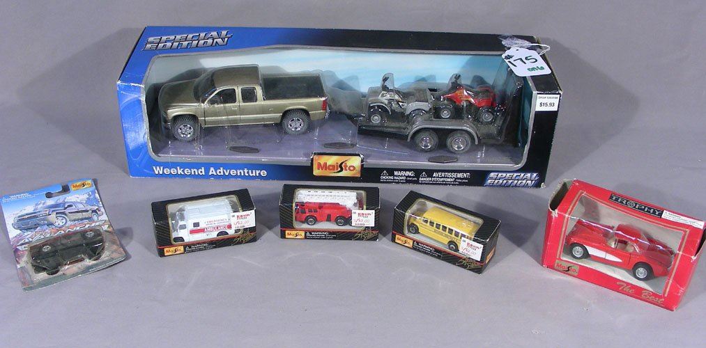 A Special Edition Weekend Adventure including truck, trailer and 2 ATV's and a Trophy red sports car and 3 miniature Special Edition vehicles - school bus, ambulence, fire truck and Avalanch 2002.