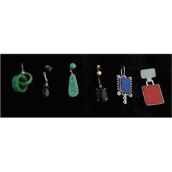 Lot 157 SIX PAIRS OF EARRINGS. 1) Carved green jade drop earrings in gold setting. 2) Drop earrings with 12mm x 16mm black onyx cabochons in yellow gold setting. 3) Drop earrings with black onyx teardrop shaped drop in 14kt yellow gold. 4) Square carnelian set in sterling silver. 5) Square lapis in sterling silver with French wires. 6) Green jade of two interlocking circles suspended from yellow gold wires. CONDITION: Very good. 5-69460 (50-100)