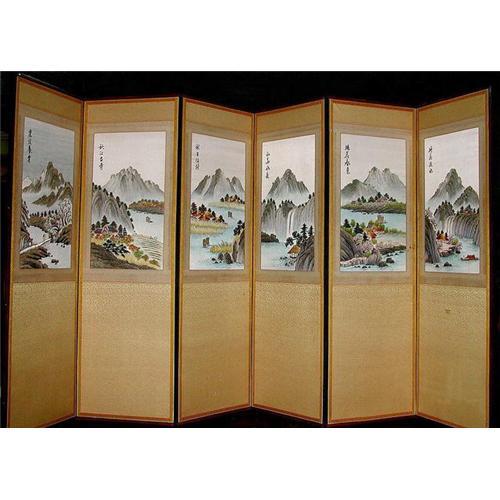 A KOREAN SILK-EMBROIDERED SIX-PANEL FOLDING LANDSCAPE SCREEN<P>A very attractive and decorative six-panel folding screen or divider, each panel hand-embroidered in multi-colored silk and bordered in silk brocade, depicting a variety of landscape, mountain, waterfall and village scenes from the Korean countryside. This stunning embroidery is finely stitched and of excellent quality, with each separate panel having an embroidered inscription by the artist. <p>The folding screen may be mounted on a wall, or used as a standing folding space divider. There is some oxidation to the background borders, but overall the piece is is good condition. There is a small tear to the bottom (non-decorated) half of the extreme right panel, which can be restored or backed. Each of the six panels is 57" high by 18.5" wide. Origin is Korea.