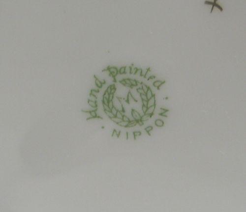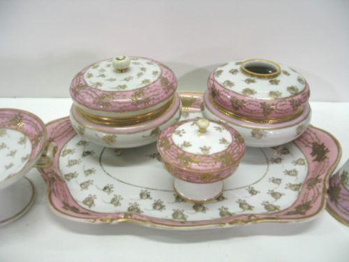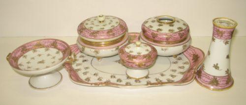 SIX PIECE NIPPON VANITY SET. Pink and jeweled gilt design. Consists of tray (11.75” L), one small compote (2.25” H), one hat pin holder (4.75” H), one covered hair receiver on three gilt feet (3” H), one small covered compote (2.75” H), and one covered dresser jar (3.5” H). All show minor loss to gilt. All are marked with either blue or green Nippon wreath mark.