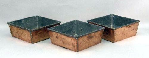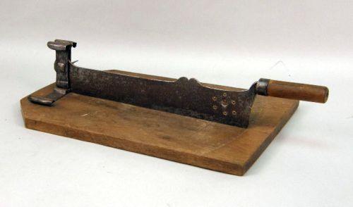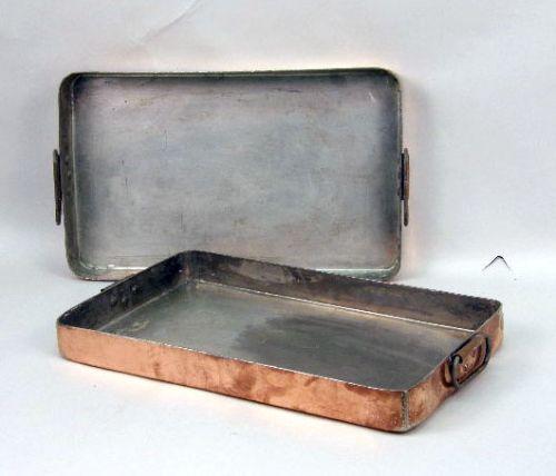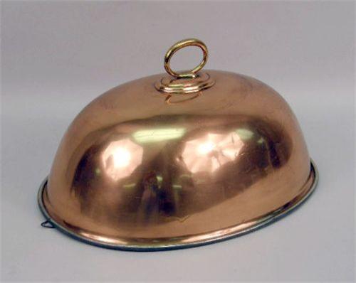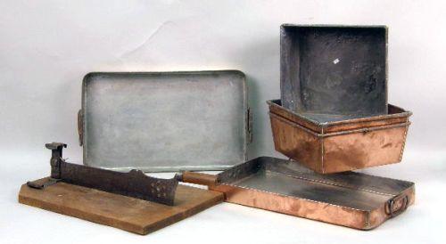 Comprising three square bread or cake tins, two roasting pans and a large copper dome for a serving platter, marked underneath "JMW/18 IN/2781". Together with a massive 18th/19th century iron and oak chopper, the blade stamped with an anchor surrounded by six stars. 7 pieces. Square pans 5"h x 12"sq., roasters 2"h x 19 3/4"h x 12 1/2"d Serving platter for dome lacking. Most of the pieces need re-tinning, the copper with finger marks and stains, soldering seams visible in some pieces.