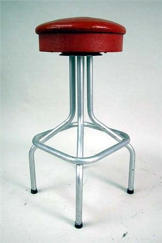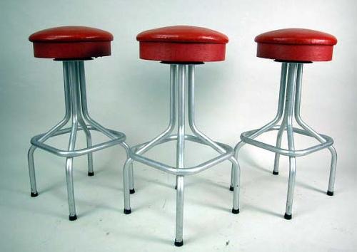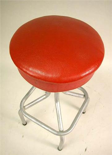 SIX TUBULAR METAL BAR STOOLS WITH ROUND RED FAUX LEATHER SEATS Wear throughout, 31 1/2"h x 14"d