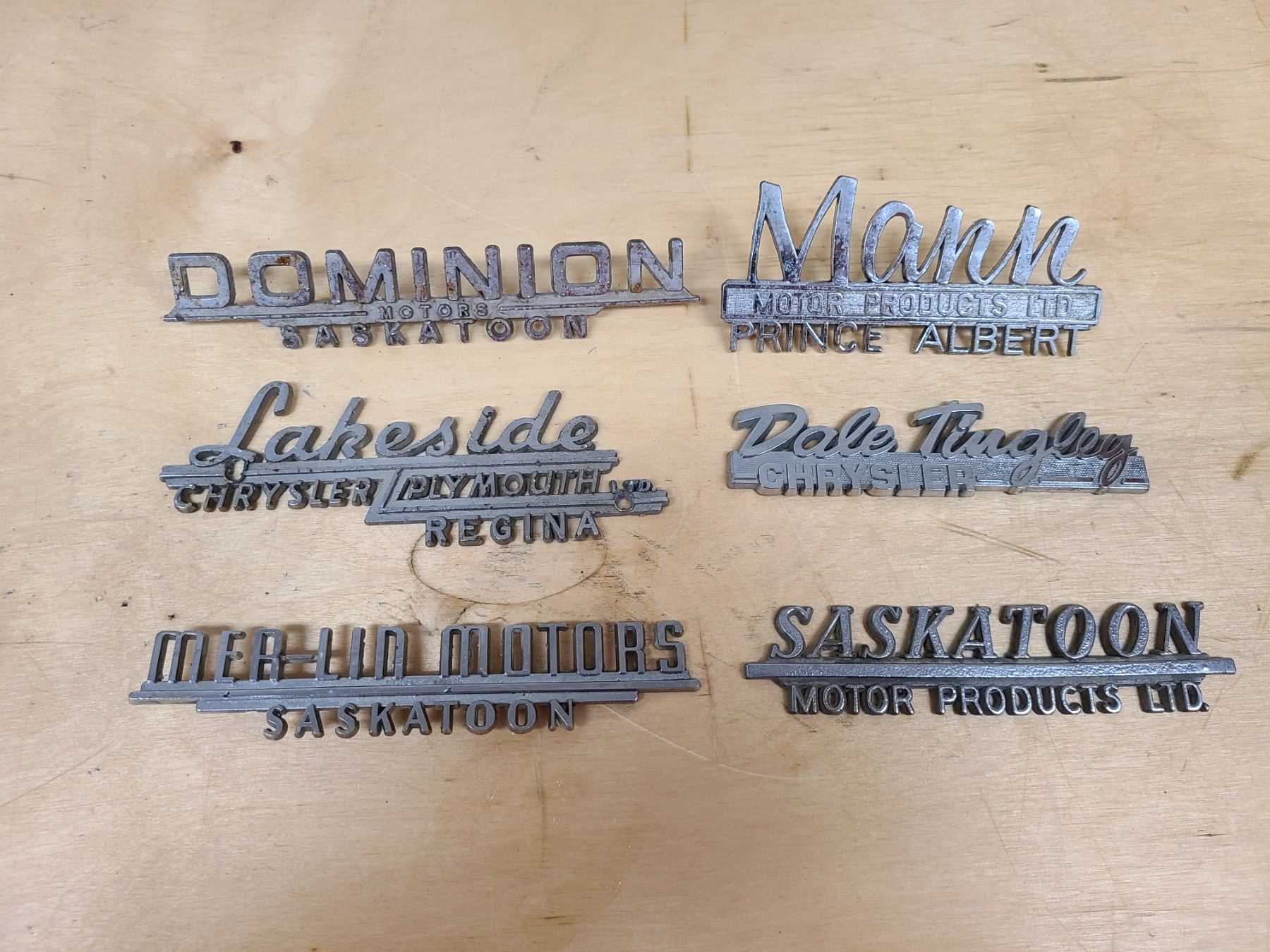 SIX VINTAGE CAR DEALERSHIP METAL EMBLEMS FROM SASKATCHEWAN