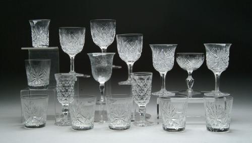 SIXTEEN CUT GLASS ITEMS. Lot consists of three water goblets cut in fan and crosshatch pattern, two wine glasses cut in hobstar and fan pattern, small tumbler cut in feathered fan and diamond pattern, two wine glasses cut in fluted diamond pattern, wine glass cut in floral pattern, champagne stem cut in diamond and fan pattern and six rock glasses cut in crosshatch and fan pattern. SIZE: Range from 3-1/4 in. to 6-1/4 in. t. CONDITION: Two of the rocks glasses have pin nicks on the rim, all of the remaining glassware is very good to excellent. Estate of Edwin Schiebel Sr. 5-60116, 5-60125