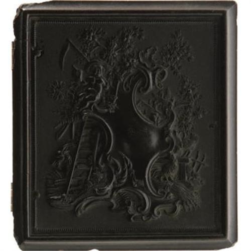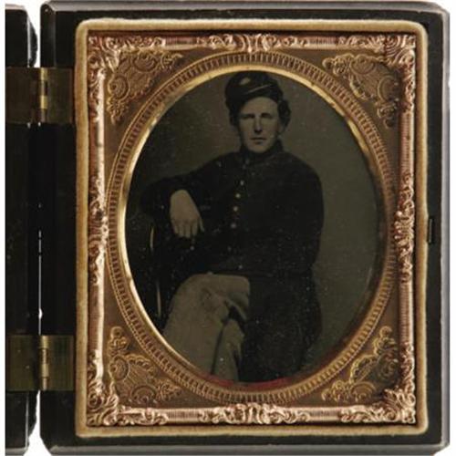 <B>SIXTH PLATE TINTYPE OF FEDERAL SOLDIER WEARING 22ND CORPS BADGE, CA 1860S.</B></I> A confident Union private strikes a casual seated pose for the photographer. The significance of this image can be found in the five-branched 22nd Corps badge affixed to the crown of his kepi. This corps was formed early in 1863 for the defense of Washington and became heavily engaged at Fort Stevens during the early July 1864 attack on the Federal capital. The photograph, secured in a brass mat under glass, is housed in a gutta-percha case molded with a fanciful agrarian scene on both sides. <BR><B><BR>Condition:</B></I> Very fine, the gutta-percha case has some minor chipping to the extremities.<BR><BR><b>Shipping:</b> Miscellaneous Collectibles, Smal (<a target="_blank" href="http://www.heritageauctions.com/common/shipping.php">view shipping information</a>)