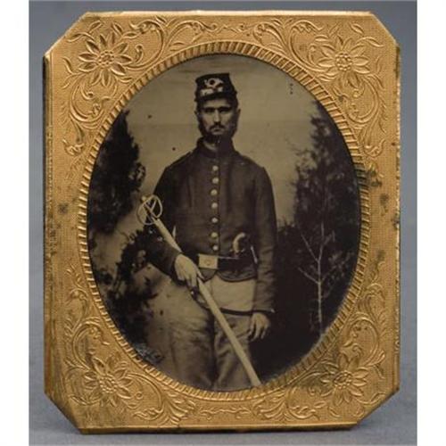<B>SIXTH PLATE TINTYPE UNION SOLDIER WITH SWORD AND PERCUSSION PISTOL CA 1860S.</B></I> This 2.75” x 3.25”tintype is of an unidentified Union soldier. He is standing in a studio looking very bored at the photographer, holding his parade sword and with a percussion pistol stuck in belt. This image has a gilded frame only (no case). <BR><BR><B>Condition:</B></I> Fine, light scratches & corrosion on tintype, frame discolored.<BR><BR><b>Shipping:</b> Miscellaneous Collectibles, Smal (<a target="_blank" href="http://www.heritageauctions.com/common/shipping.php">view shipping information</a>)