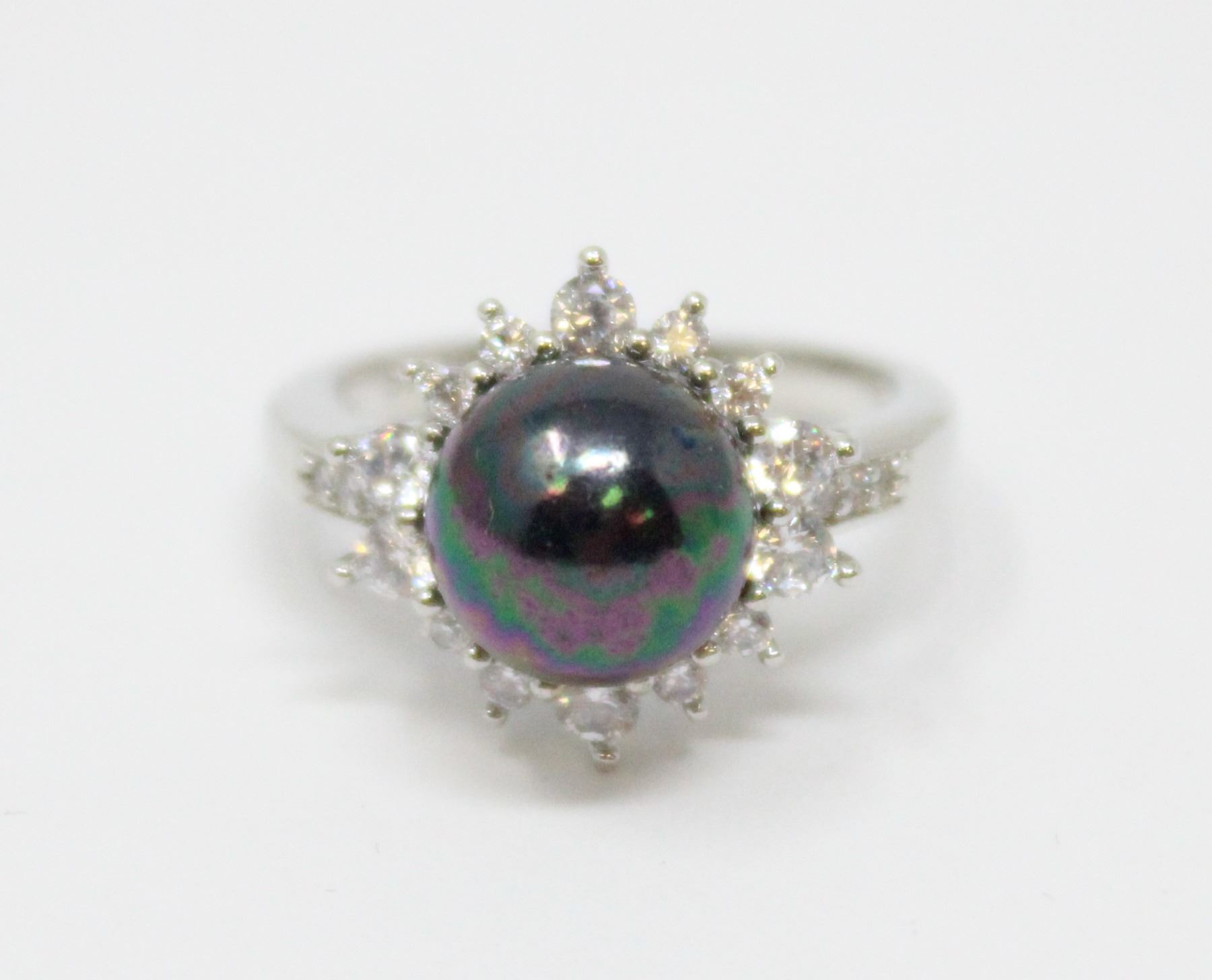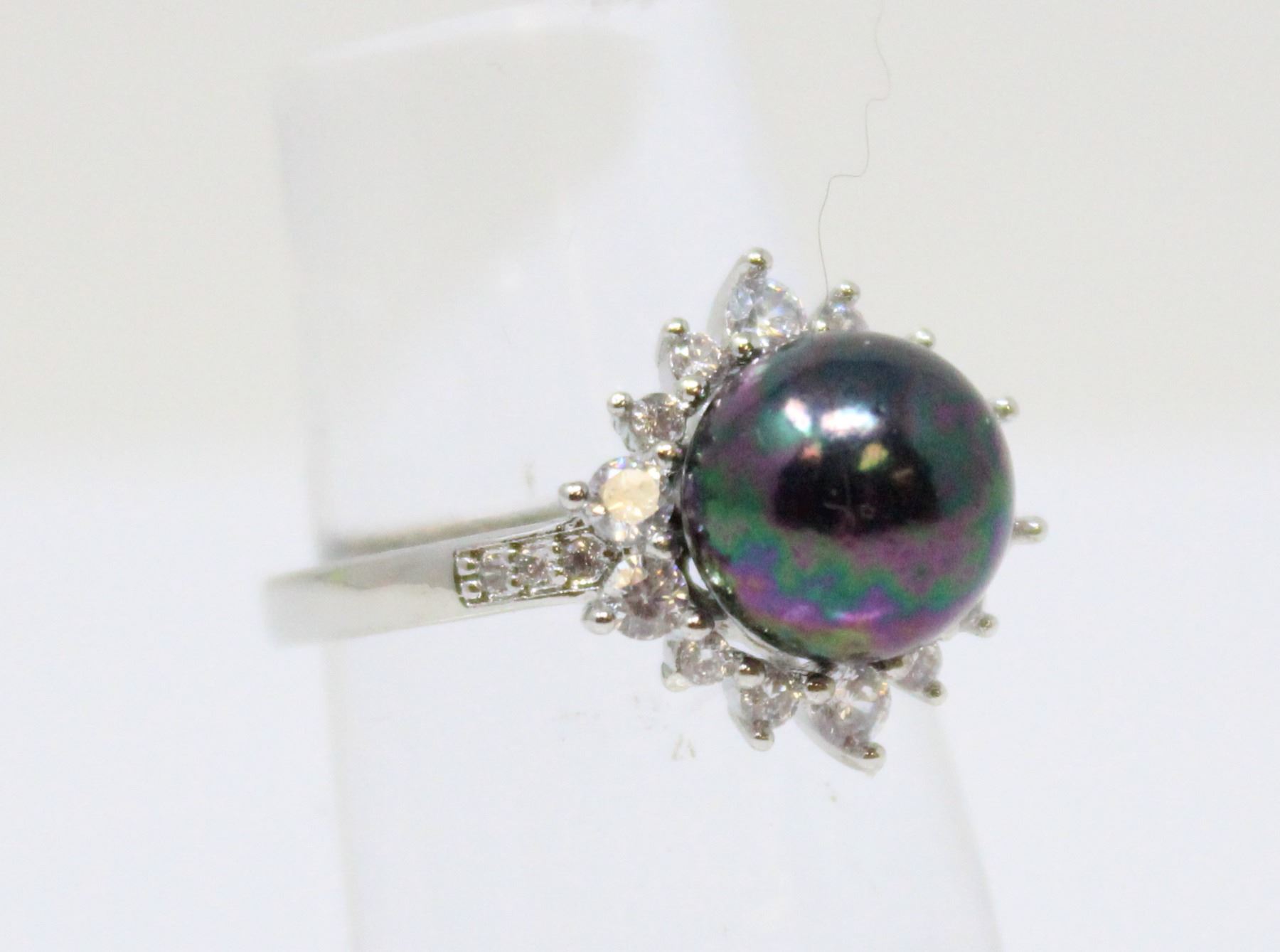 SIZE 7, .925 STAMPED SILVER CZ DIAMOND PEARL RING