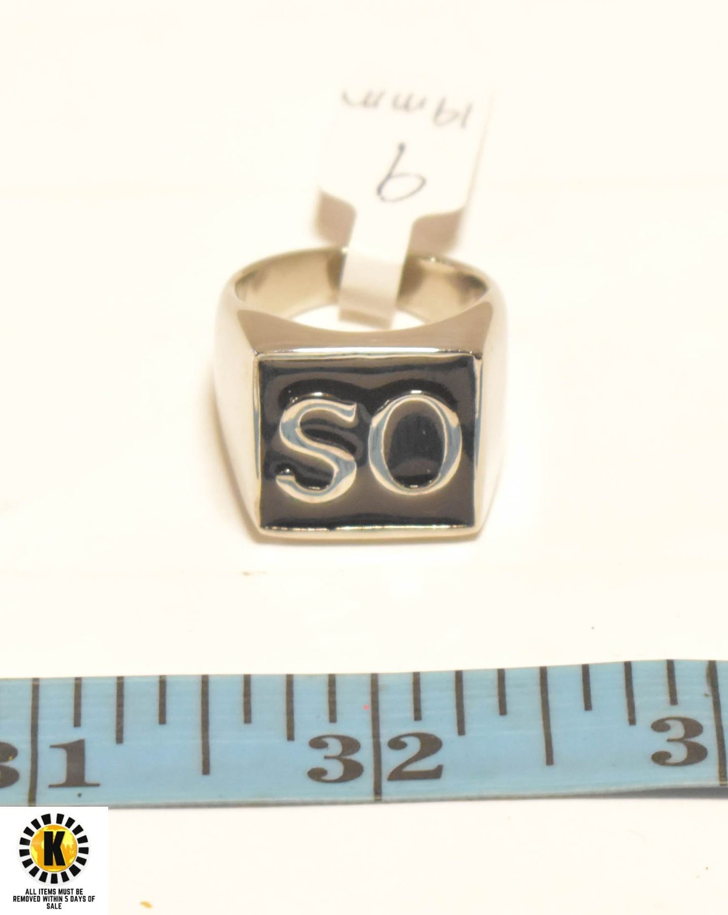 SIZE 9 INSIGNIA RING: "SO" (19 MM = SIZE 9)
