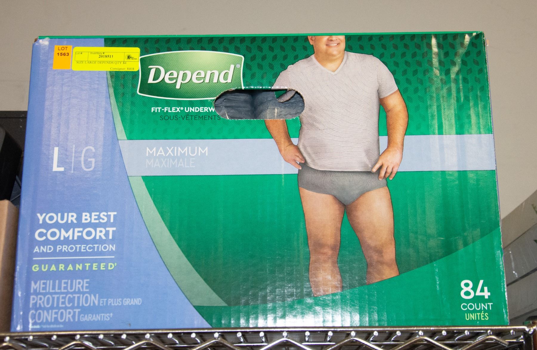 BRAND NEW IN BOX DEPNDS QTY 84 SIZE LARGE **ALL ITEMS MUST BE REMOVED BY 5PM FRIDAY, SEPTEMBER 2ND, 2022. ALL REMAINING ITEMS WILL BE SUBJECT TO A $6.00 PER DAY STORAGE CHARGE. ANY ITEMS REMAINING AFTER FRIDAY, SEPTEMBER 2, 2022 WILL BE CONSIDERED FORFEITED. NO REFUNDS WILL BE ISSUED FOR FORFEITED ITEMS.** TO SCHEDULE A PICK UP APPOINTMENT. CLICK HERE