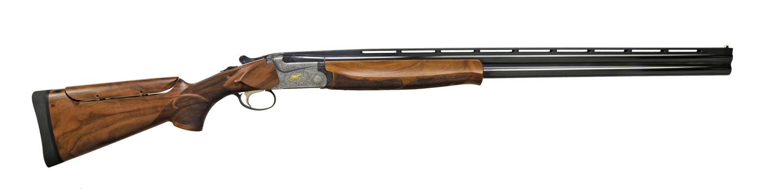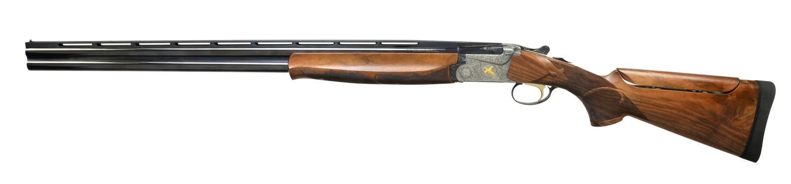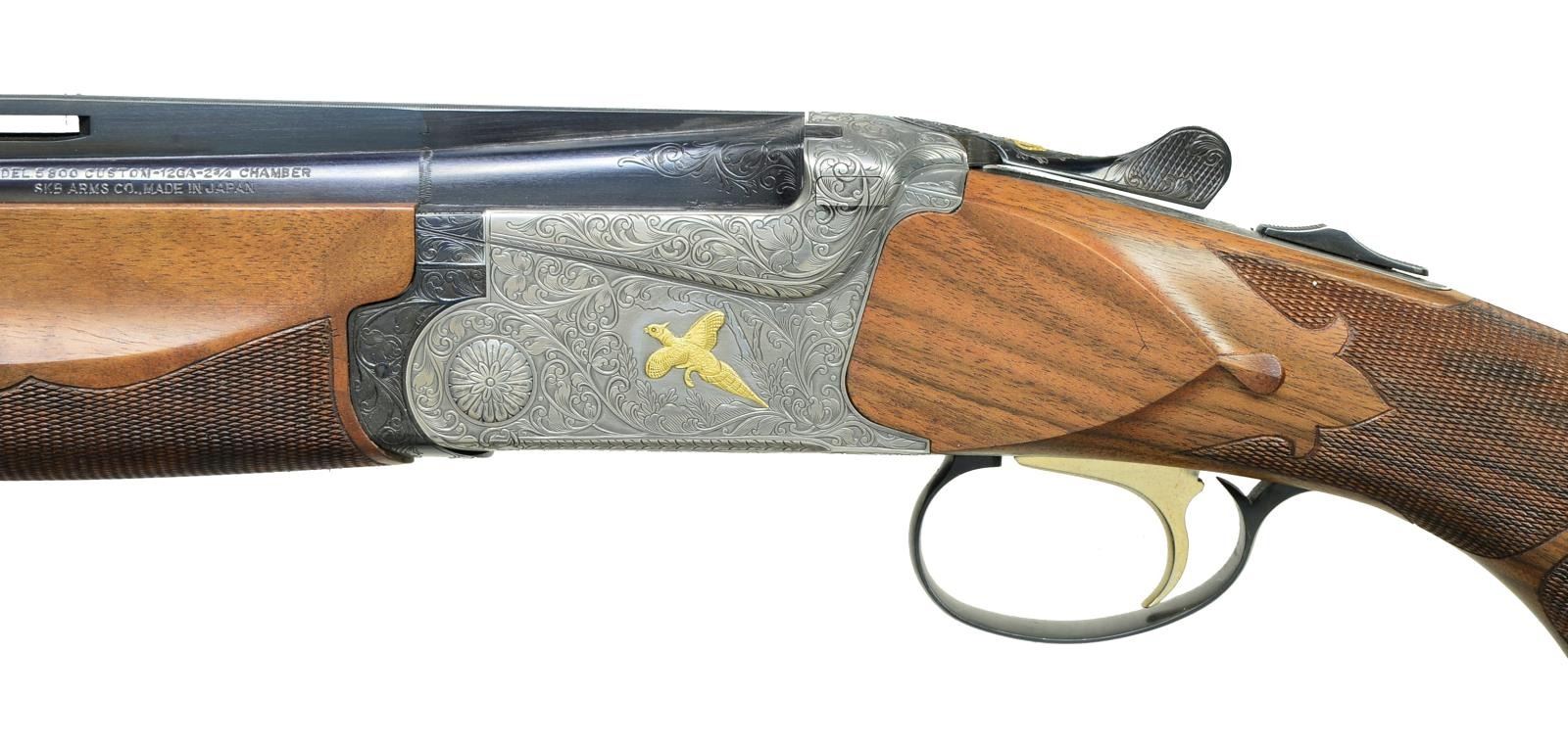 SHOTGUN. Cal. 12 Ga., 2 3/4". S# S9800144. The 5000 Series Target model shotguns were featured in a Feb. 1984 catalog. Full production was never reached & the limited quantities produced never reached the United States. One of only 5 Model 5800 Trap guns that were mfg., this gun remained in Japan until the SKB factory closed when it was imported by SKB USA. Bbls. 30" w/ 13mm wide Broadway style VR. White target front sight w/ steel mid bead. Fixed Imp. Mod. & Full chokes. Boxlock action w/ Nitride finish. Raised gold ornamentation consist of pointing dog on right side, flying pheasant on left, bobwhite quail on floorplate & gold crown on top lever. Figures are surrounded by full coverage foliate scroll engraving that continues to forearm iron, top lever & trigger guard bow. As few as 10 guns w/ non selective mechanical single trigger were produced. The non selective trigger was a step towards the development of the detachable trigger guns that SKB referred to as the "ALL MIGHTY" shotgun. Selective ejectors. Schnable tipped forearm & pistol grip stock of fancy Turkish walnut w/ satin finish. Features include fine borderless segmented fleur de lis cut checkering, tear drop points behind ears & adj. comb. LOP: 14 1/4" over an XLT solid black trap pad. Included is an optional checkered wood buttplate w/ brass escutcheons giving a LOP of 13 5/8". Weight: 8 lbs., 1/2 oz. UNATTACHED ACCESSORIES: SKB luggage case. Original foam lined box containing wood buttplate, cloth gun covers, trigger lock, grease, SKB siliconized gun cloth & adj. comb spacers. Also included is a copy of the rare Feb. 1984 New SKB catalog announcing the 5000 Series shotguns & an SKB Double Gun catalog. CONDITION: as new in box. (20-2417/DS). MODERN. $3,500-5,000.