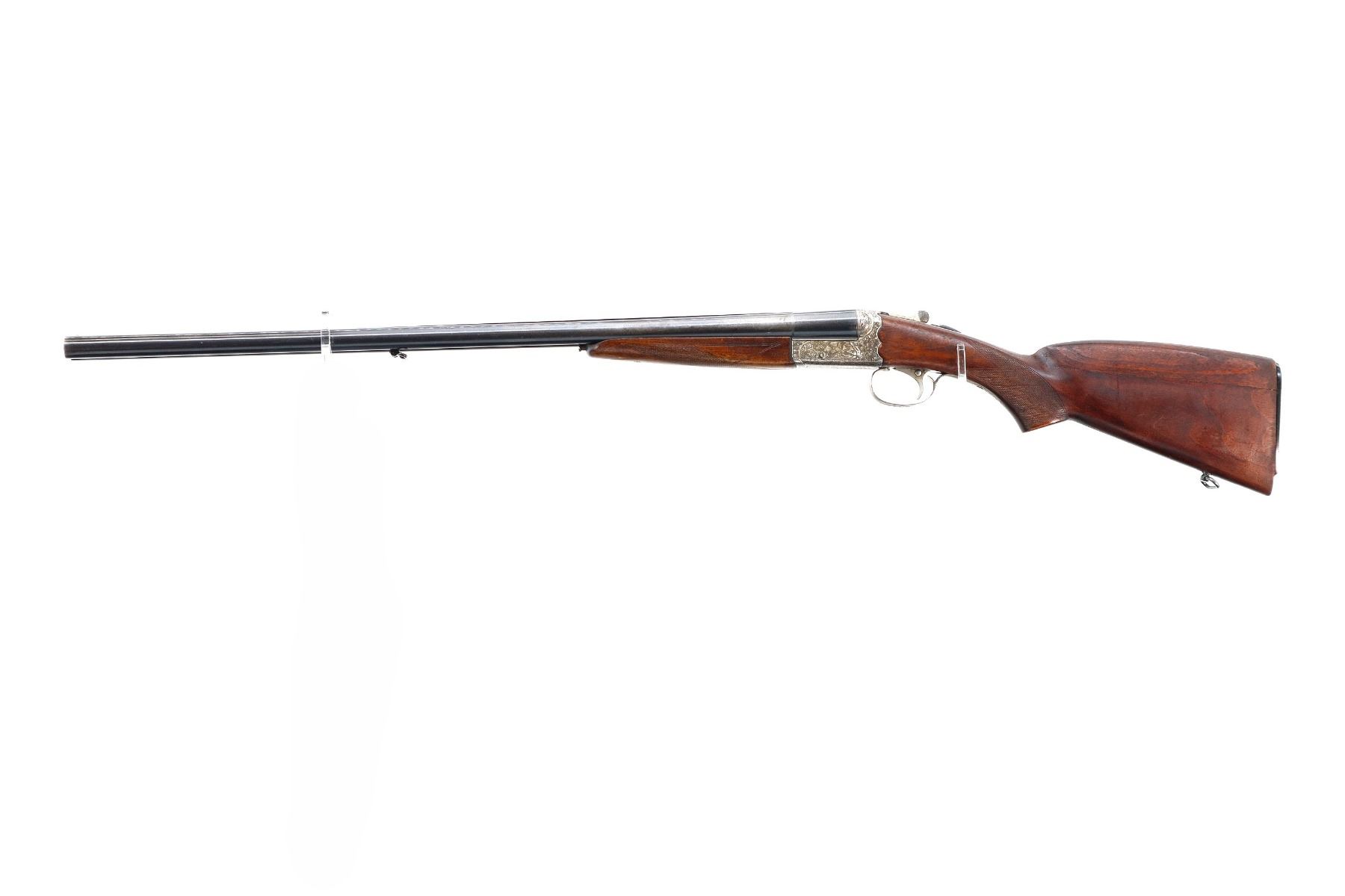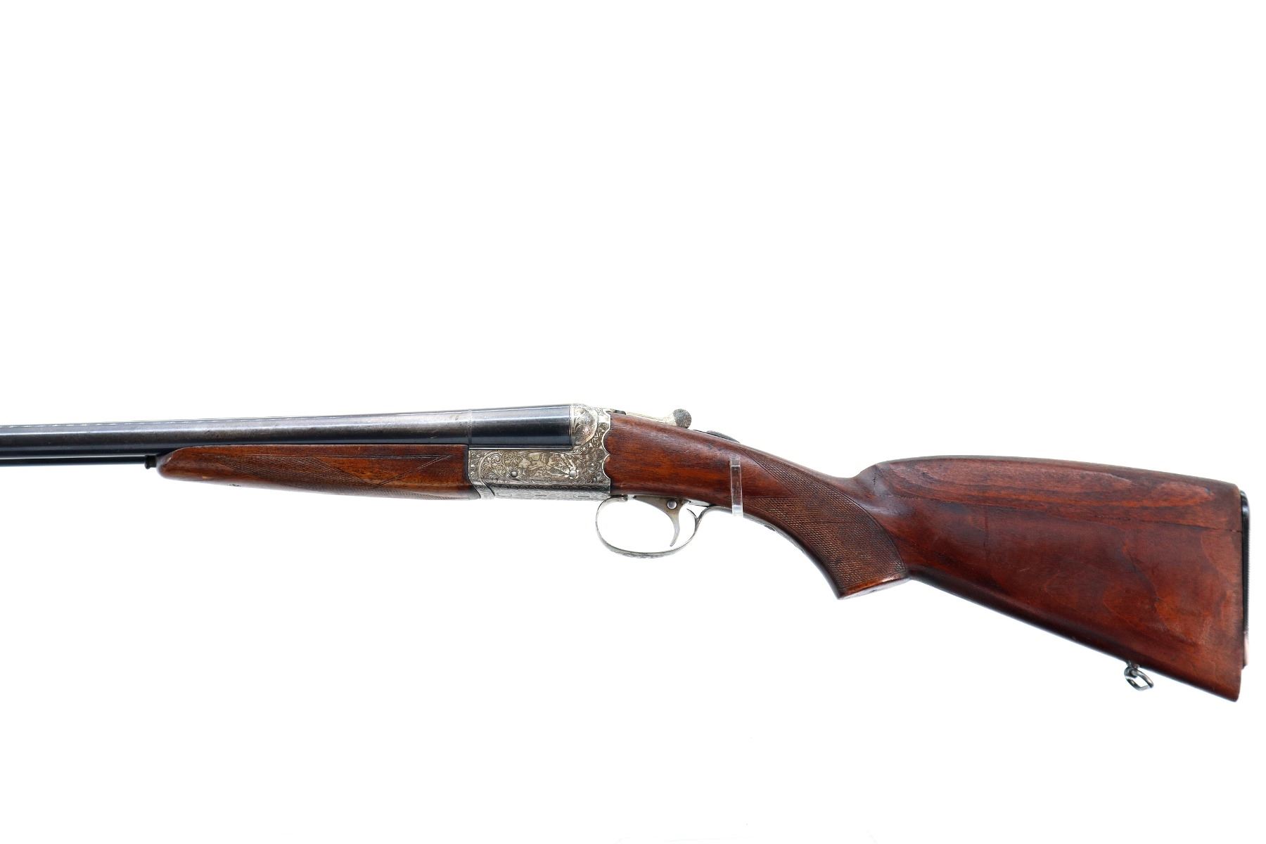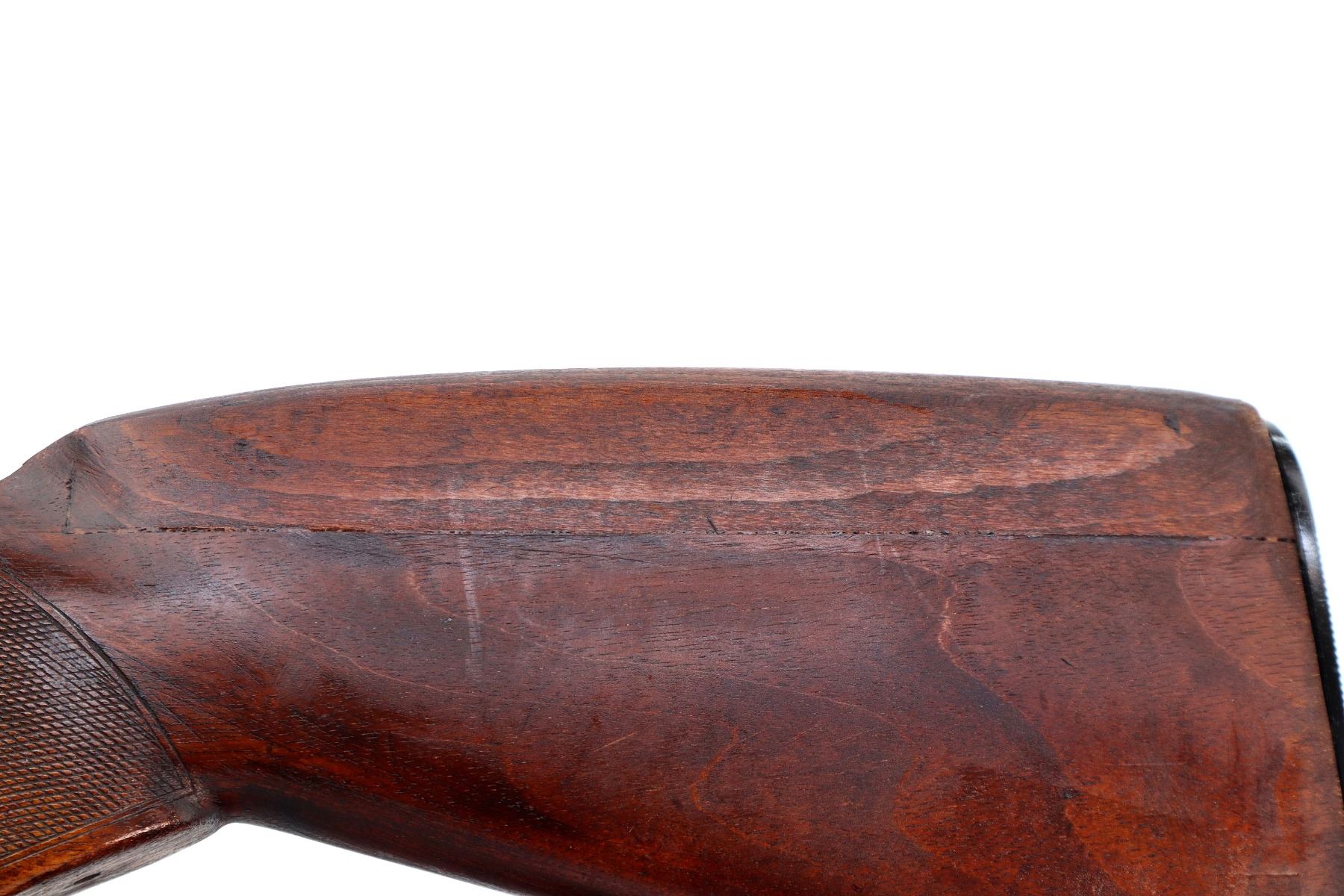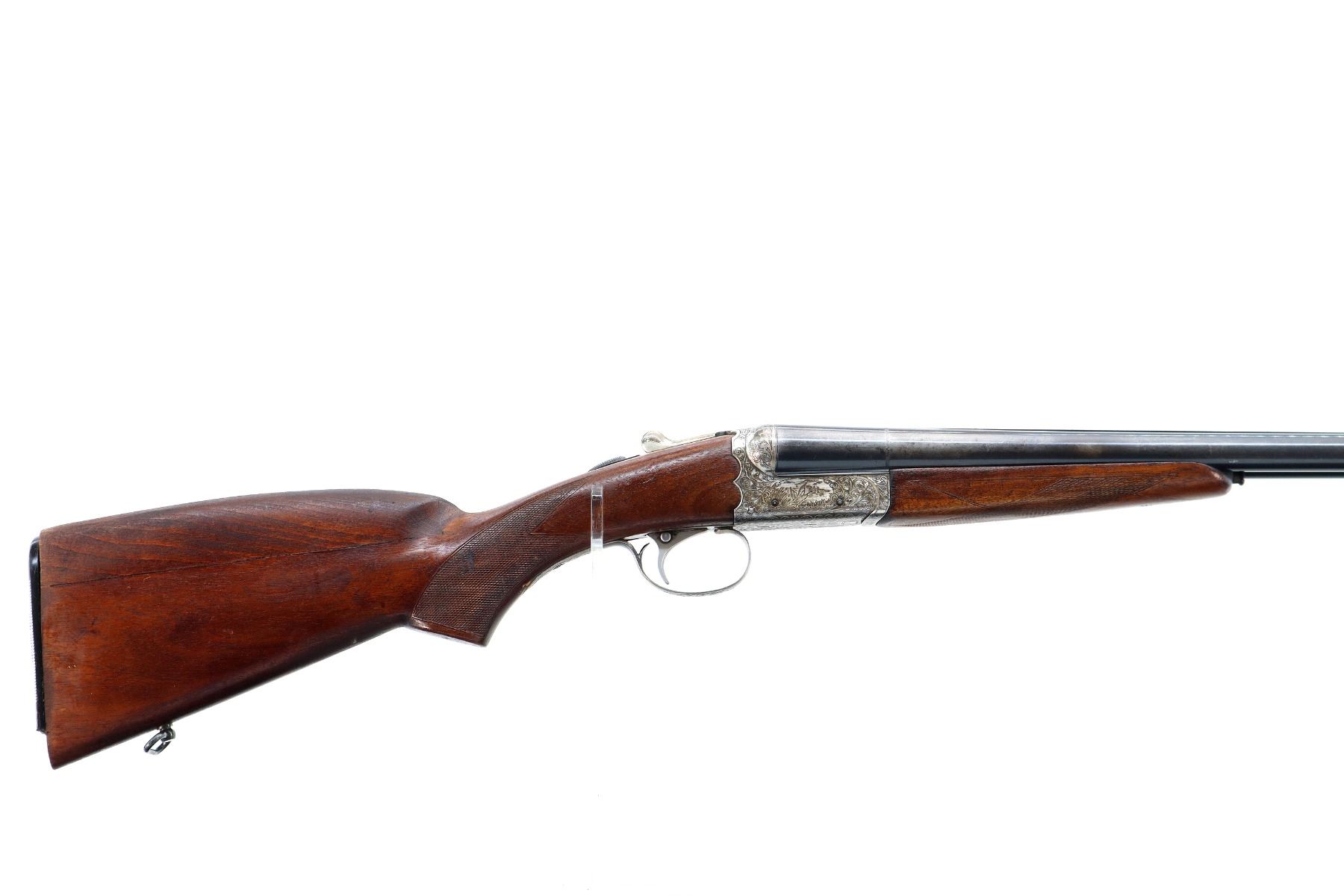 Main Description: Brass bead, blued barrels with raised rib, engraved receiver, automatic safety, extractor, single selective inertia trigger. Two piece wood stocks, checkered forearm and pistol grip, raised modified comb, grooved black polymer butt plate which is broken, 13.25" LOP, sling swivels.