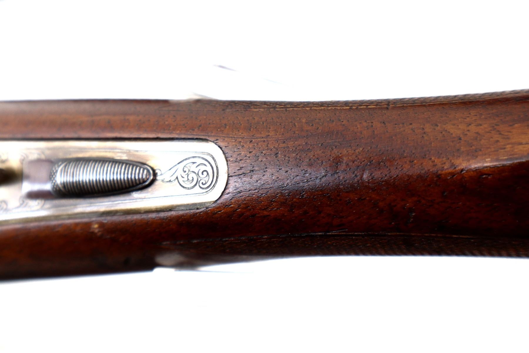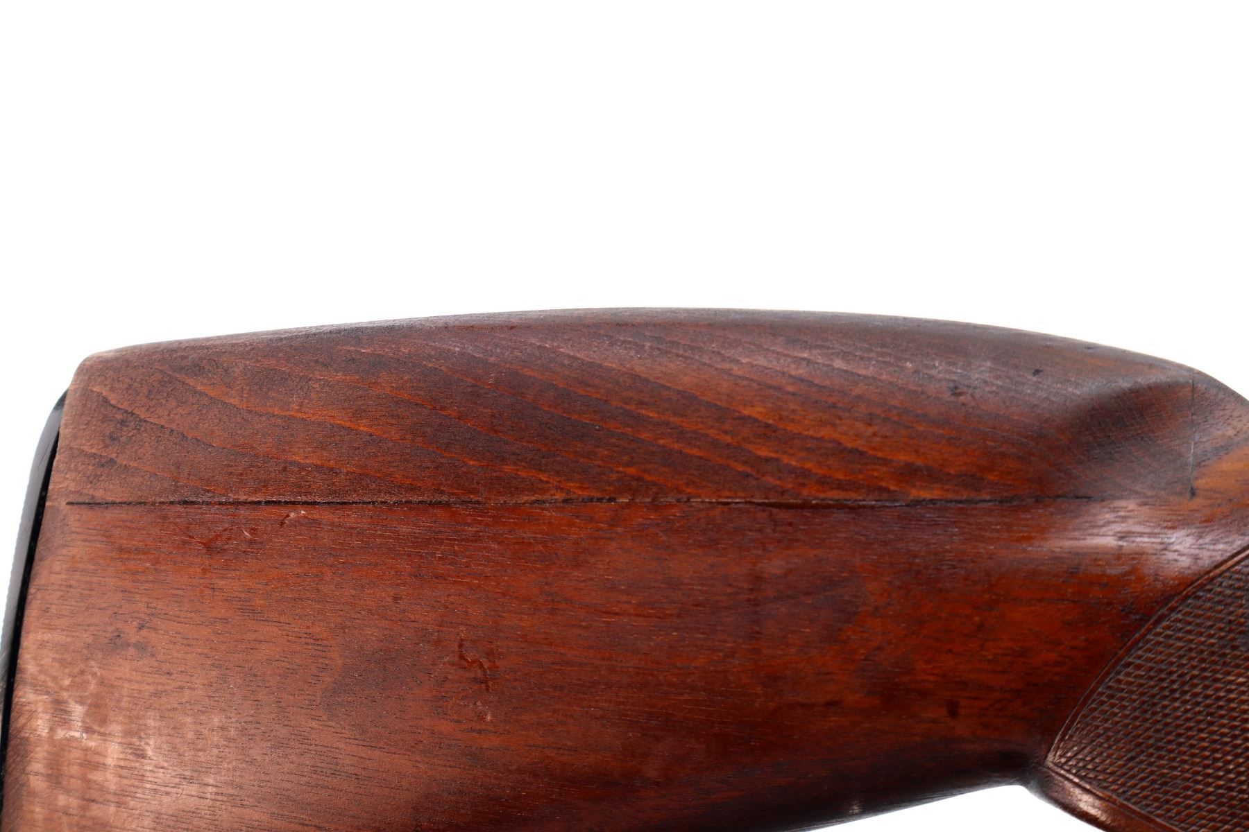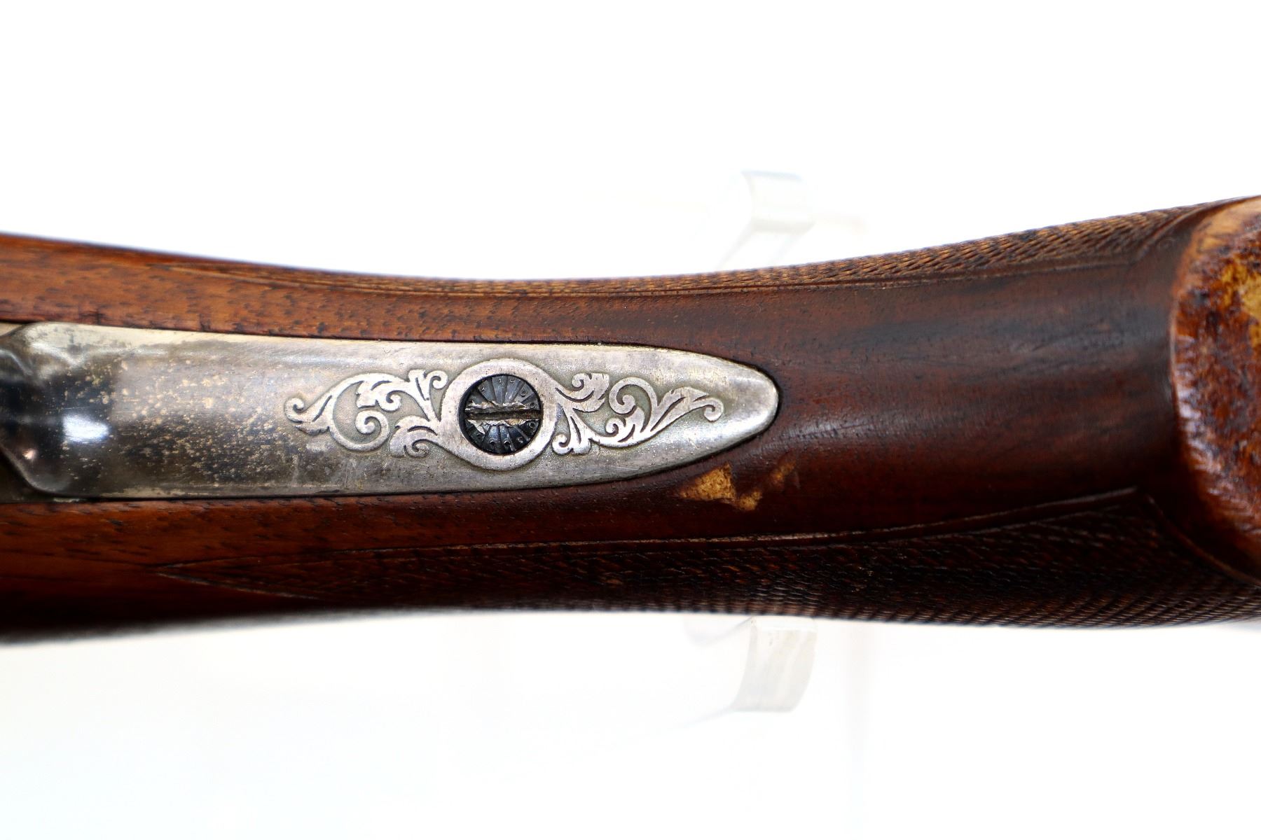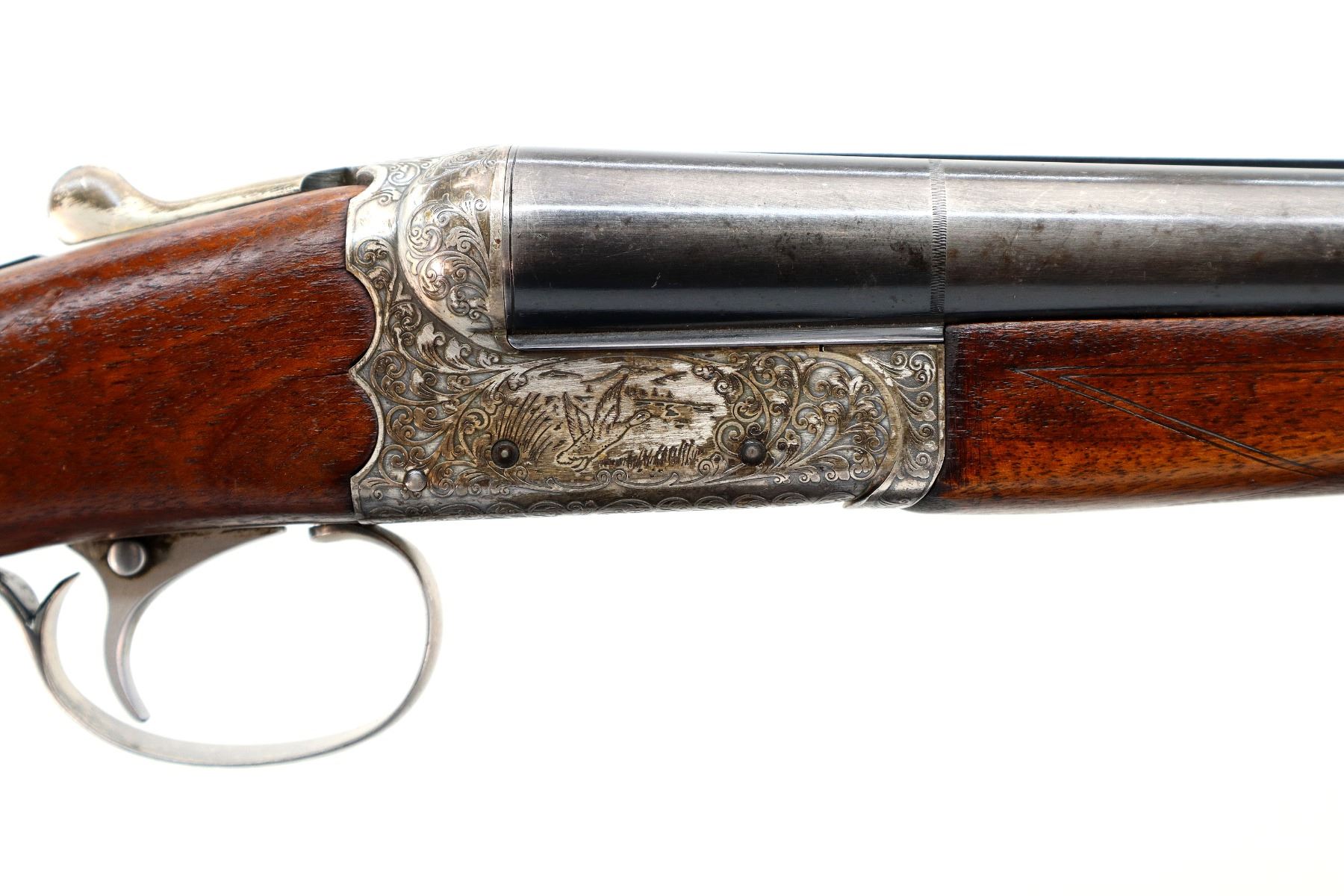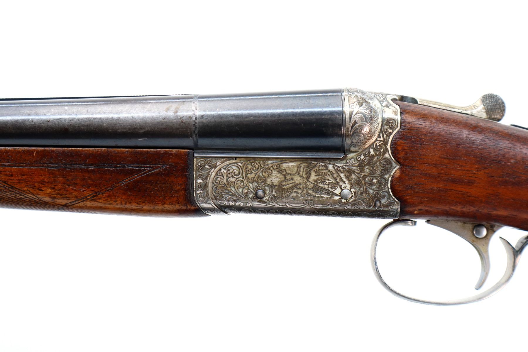 Main Description: Brass bead, blued barrels with raised rib, engraved receiver, automatic safety, extractor, single selective inertia trigger. Two piece wood stocks, checkered forearm and pistol grip, raised modified comb, grooved black polymer butt plate which is broken, 13.25" LOP, sling swivels.