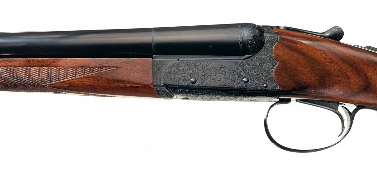 Manufactured in Japan. Red insert front sight, modified and skeet chokes, single trigger and tang mounted safety. Standard markings with importer marking "MITSUI & CO. (USA). INC.,CHICAGO.IL.". Light scrolled engraving with game birds on receiver sides. Straight grip multi-point checkered English stock with gold oval inlay on bottom. Length of pull is 14 1/2 inches.