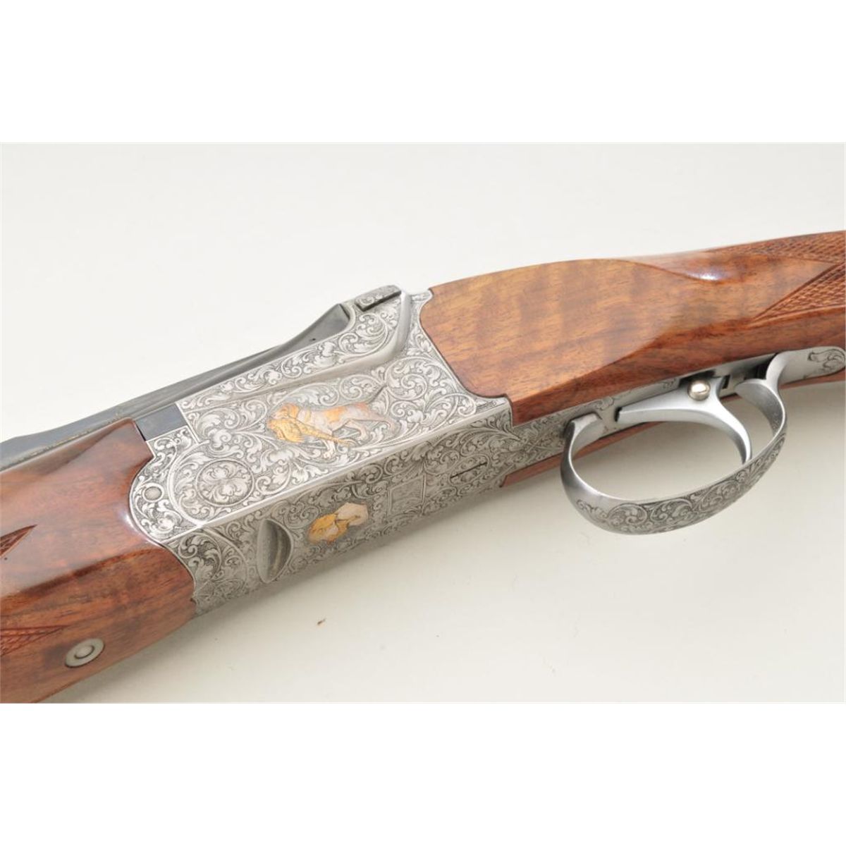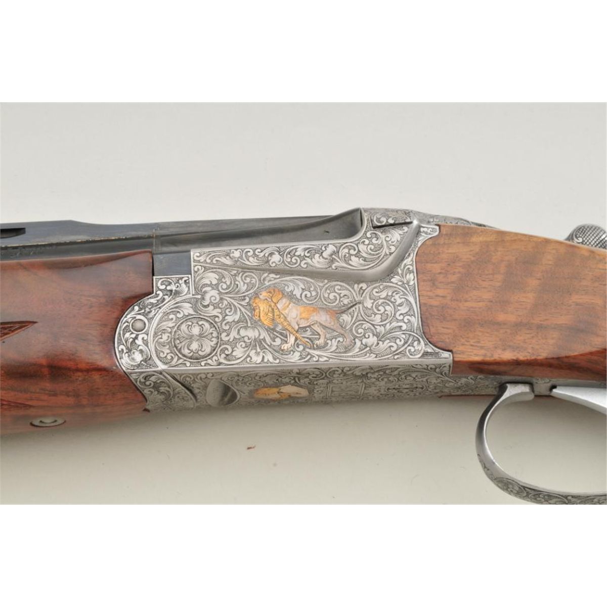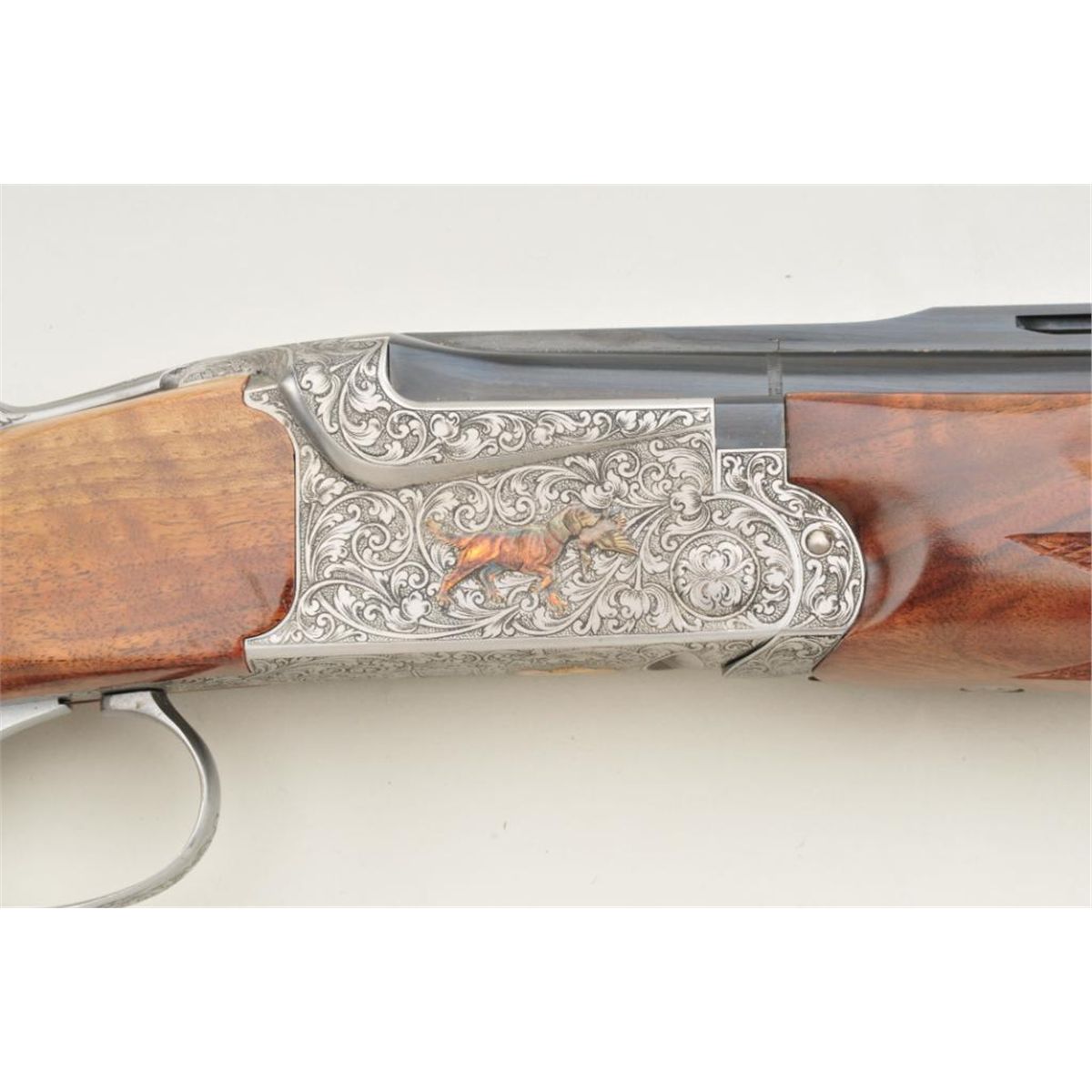SKB model 686 20ga over/under shotgun, limited edition one-of-a-kind engraved by Angelo Bee. 28” barrels, screw-in chokes, with three inserts. Serial #90469. Shows single trigger, auto ejector, wide ventilated rib. The gun is beautifully engraved in Browning-style scrolls with fine portraits and multi-color gold on each side showing dogs retrieving birds. The stock measures 14-1/4” to the end of the wood, 14-3/4 to the end of the hardrubber recoil pad. The gun is fine to excellent and shows no evidence of use. We unwrapped it from the original paper. Just some slight storage, includes original luggage type case. From the Robert Petersencollection. Est: $1,750 - $3,500