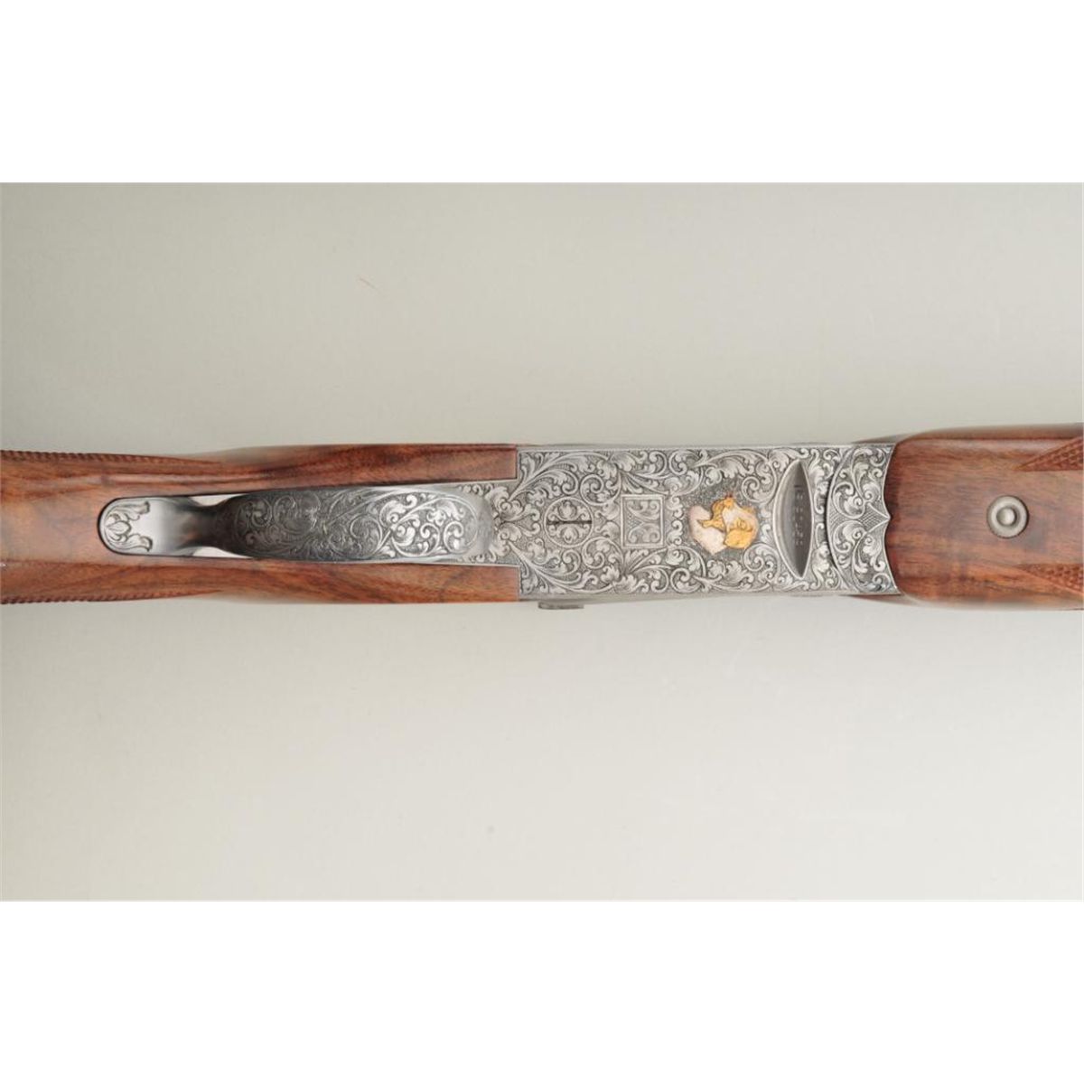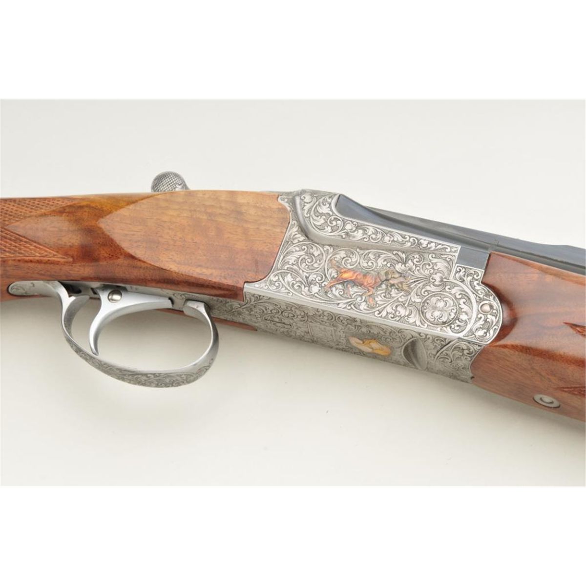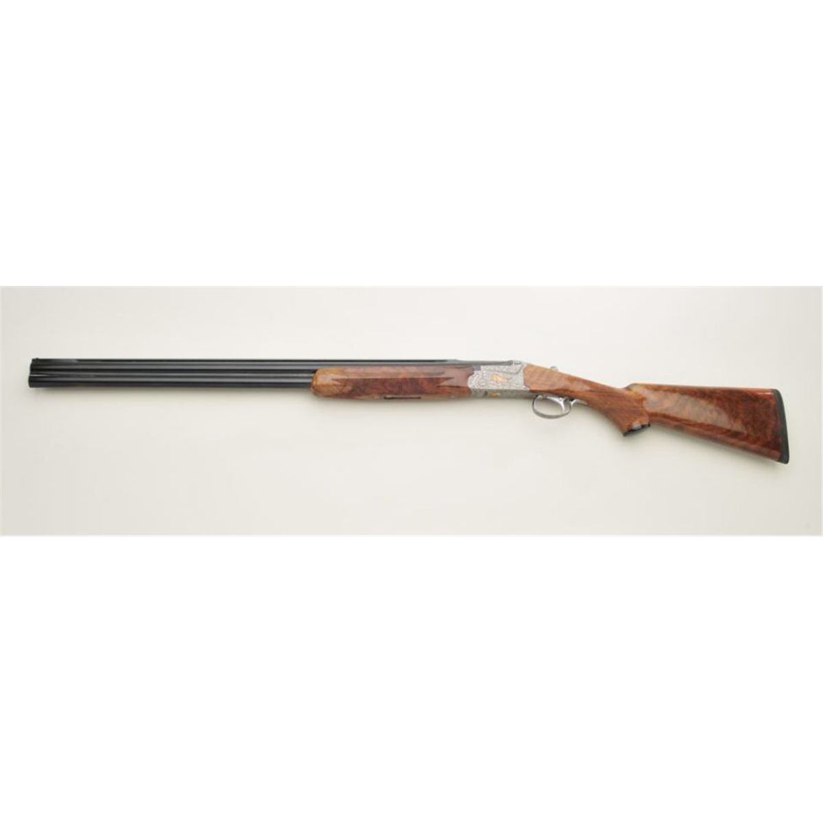 SKB model 686 20ga over/under shotgun, limited edition one-of-a-kind engraved by Angelo Bee. 28” barrels, screw-in chokes, with three inserts. Serial #90469. Shows single trigger, auto ejector, wide ventilated rib. The gun is beautifully engraved in Browning-style scrolls with fine portraits and multi-color gold on each side showing dogs retrieving birds. The stock measures 14-1/4” to the end of the wood, 14-3/4 to the end of the hardrubber recoil pad. The gun is fine to excellent and shows no evidence of use. We unwrapped it from the original paper. Just some slight storage, includes original luggage type case. From the Robert Petersencollection. Est: $1,750 - $3,500