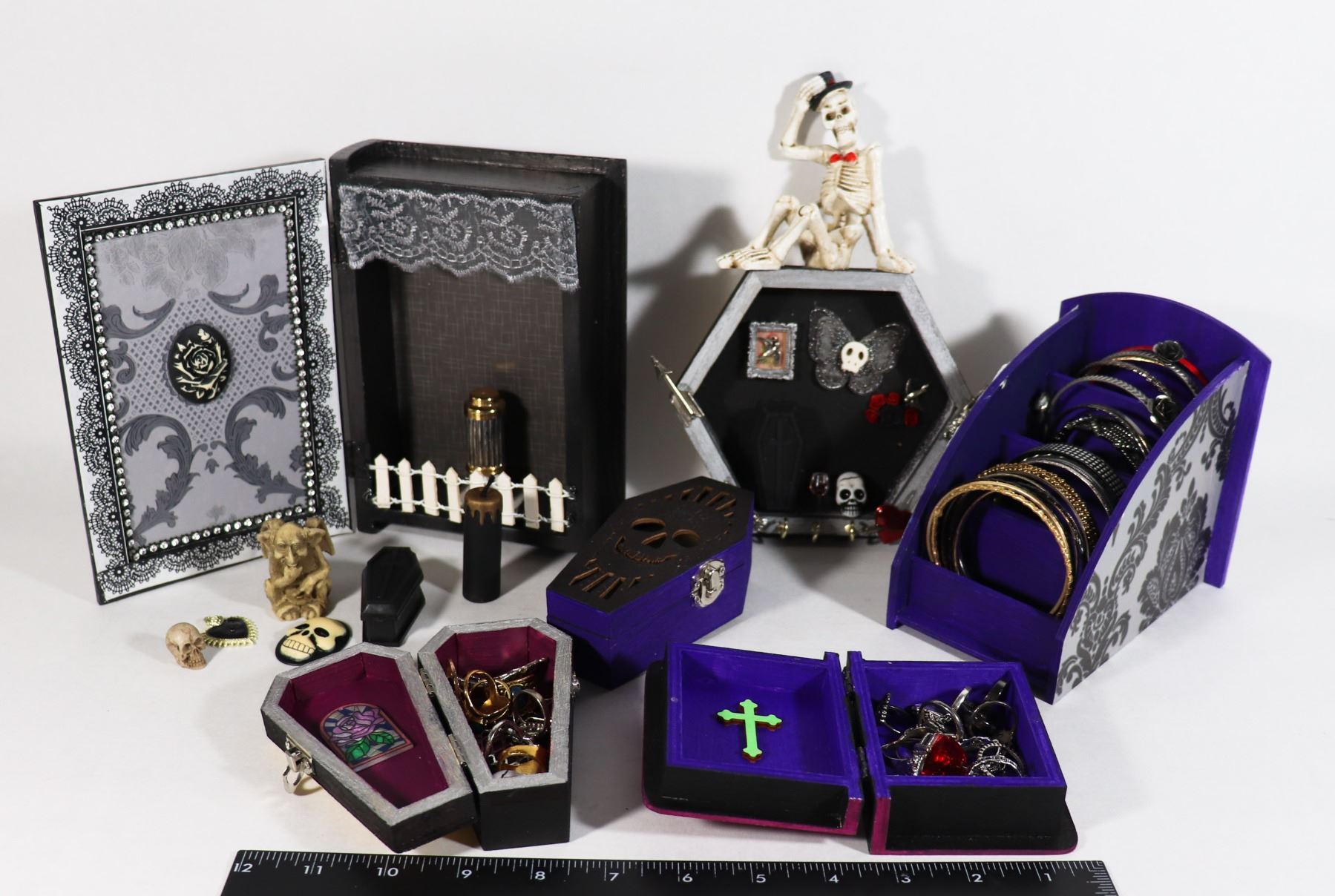 TRINKET TREASURE BOX SKULL RINGS/RINGS LIGHT UP COFFIN & COFFIN BOX FULL OF RINGS & PENDANTS CHARMS