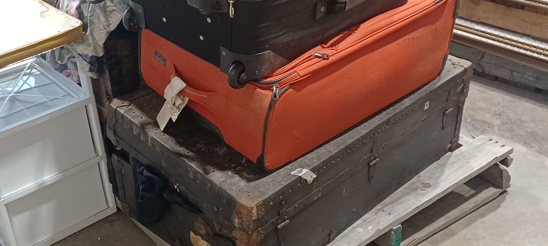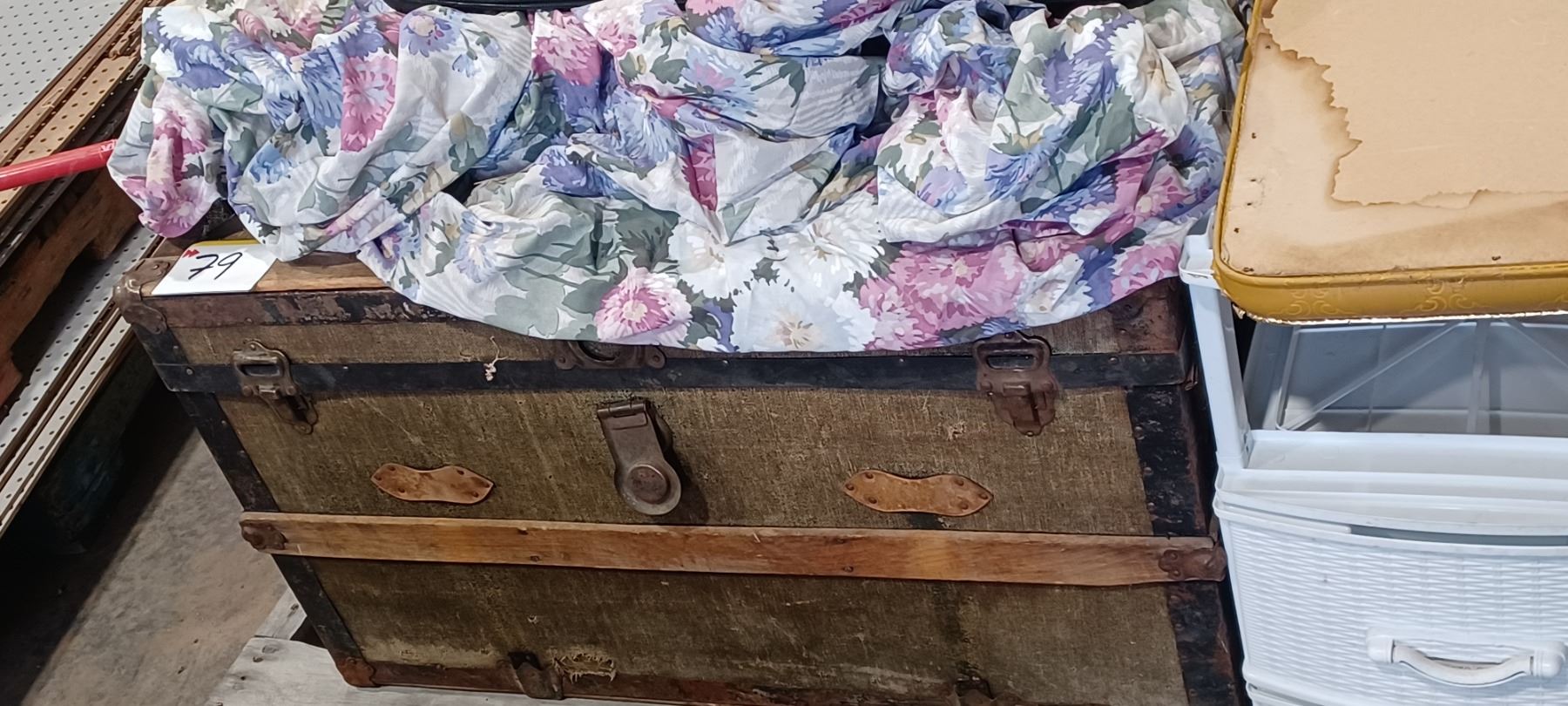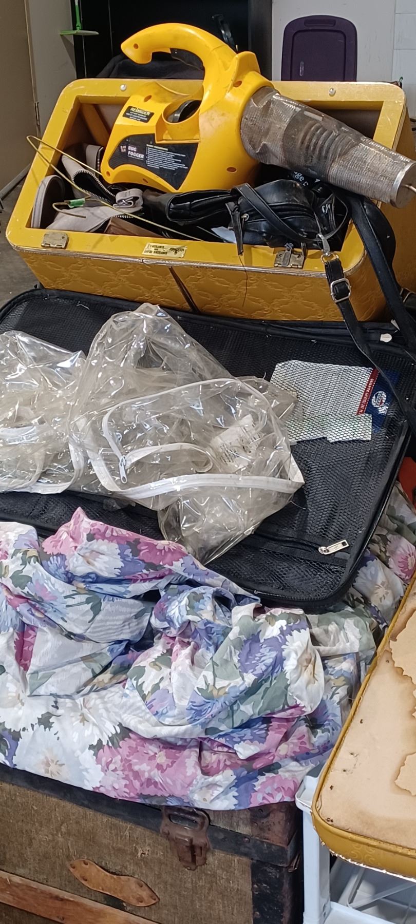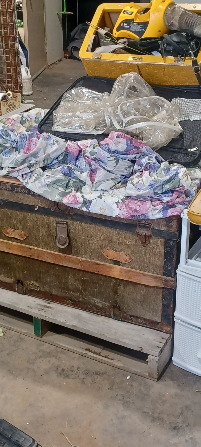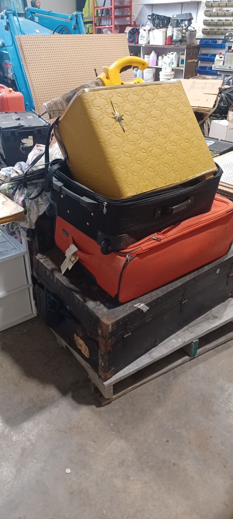 SKID WITH 2 STEAMER TRUNKS. SUITE CASES WITH CONTENTS , BUG DEFOGGER
