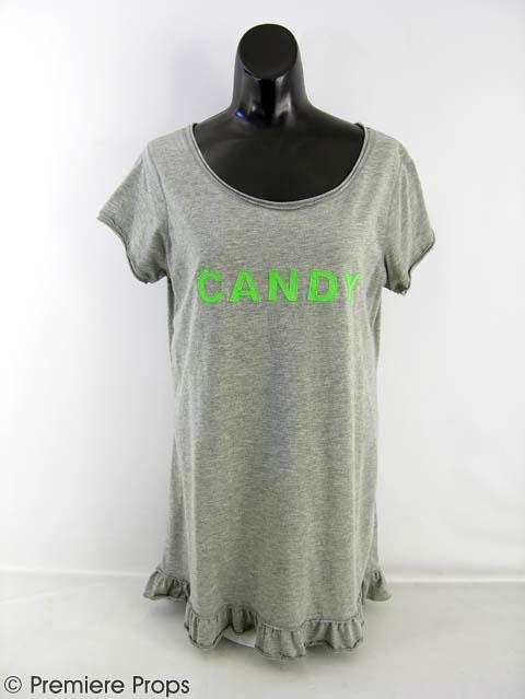 Rachel’s (Rhona Mitra) screen worn heather gray "La Senza Candy" night gown with chest screen-print reads "CANDY" in green text (size S).