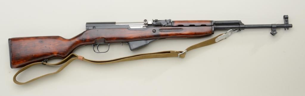 SKS semi-auto rifle, Russian-made, top of receiver dated 1954r, 7.62mm X 39 cal., import-marked, 20-1/2” barrel, mat black finish, wood stock, olive green woven sling, no bayonet, #A0150. This gun is in overallvery good condition showing considerable military blue, very good bore, crisp action, sharp markings, very good wood stock and sling. Est.: $250-$500.