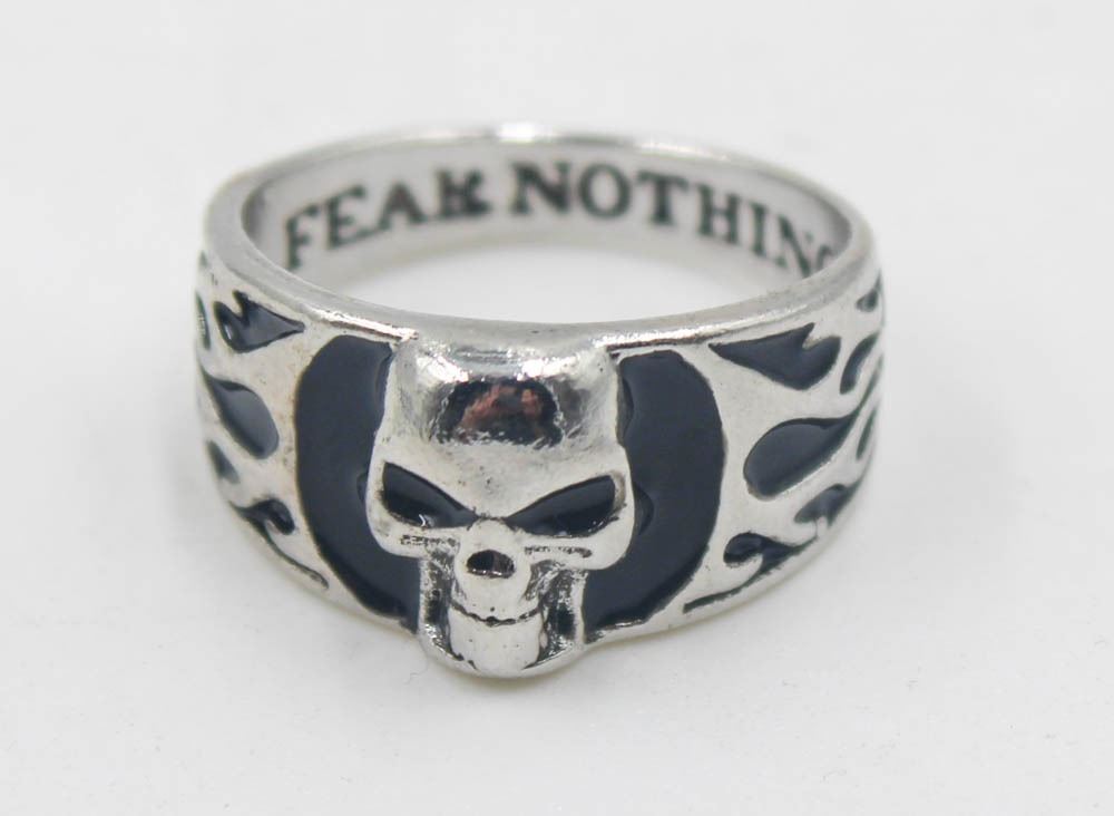 SKULL BLACK FLAMES RING WITH FEAR NOTHING INLAY,