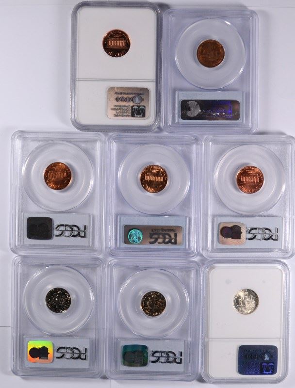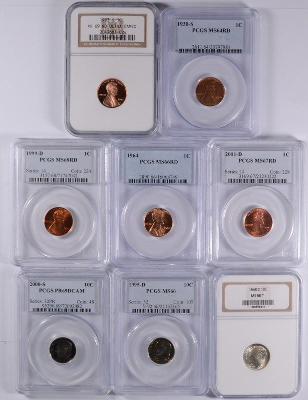 2001-D CENT PCGS MS67RED, 1999D CENT PCGS MS68 RED, 1930-S CENT PCGS MS64 RED, 1964 CENT PCGS MS66RED, 1993-S CENT NGC PR69 RED UC, EST $85-100