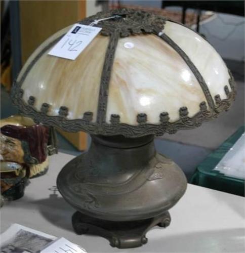 SLAG GLASS PARLOR LAMP with dragon motif, 18"d lacking a clip that retains<BR>glass panel<BR>circa 1910<BR>Packing and Shipping: $60