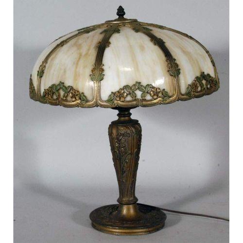 SLAG GLASS TABLE LAMP, with tinted overlay, 19" diameter, circa 1920, CONDITION REPORT: wear to patina on base, collar has a crack, base has been pushed in enough to put the base a bit out of plumb. glass all good.
