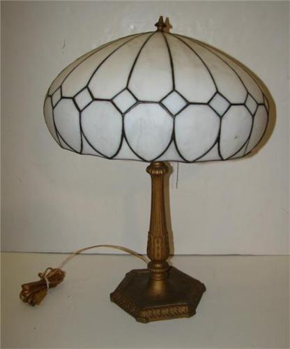 SLAG GLASS TABLE LAMP. Two-light lamp has white slag glass paneled shade and gilt metal base and stem. Electrified. 23.5” H